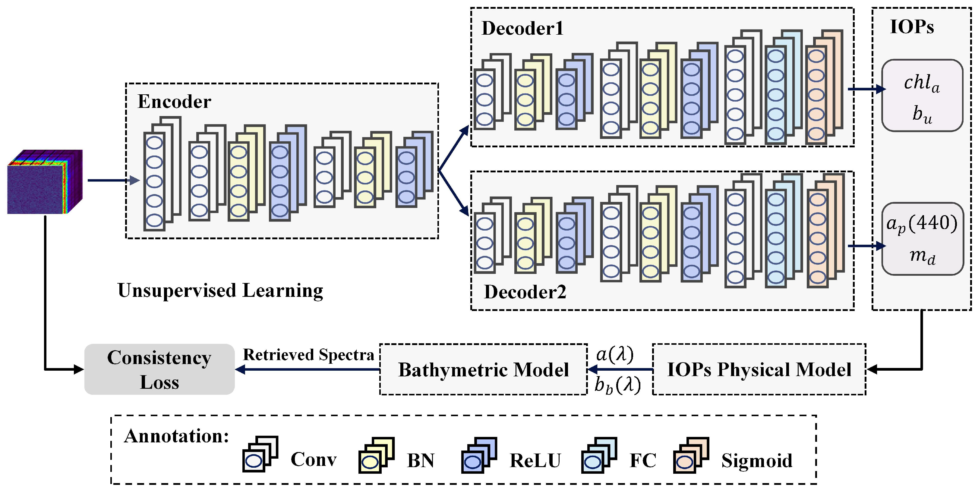 16] in retrieving water IOPs through an unsupervised autoencoder framework, several limitations still persist. First, the model is primarily based on a simplified bathymetric assumption for optical deep water, which overlooks the complexity of real aquatic environments. Under this assumption, the relationship between the IOP coefficients and the deep-water reflectance often leads to non-unique or physically inconsistent inversion results. Consequently, the existing IOPE-Net framework may fail to obtain physically meaningful and uniquely determined IOP estimations. These limitations hinder the accurate characterization of the optical properties of natural waters.