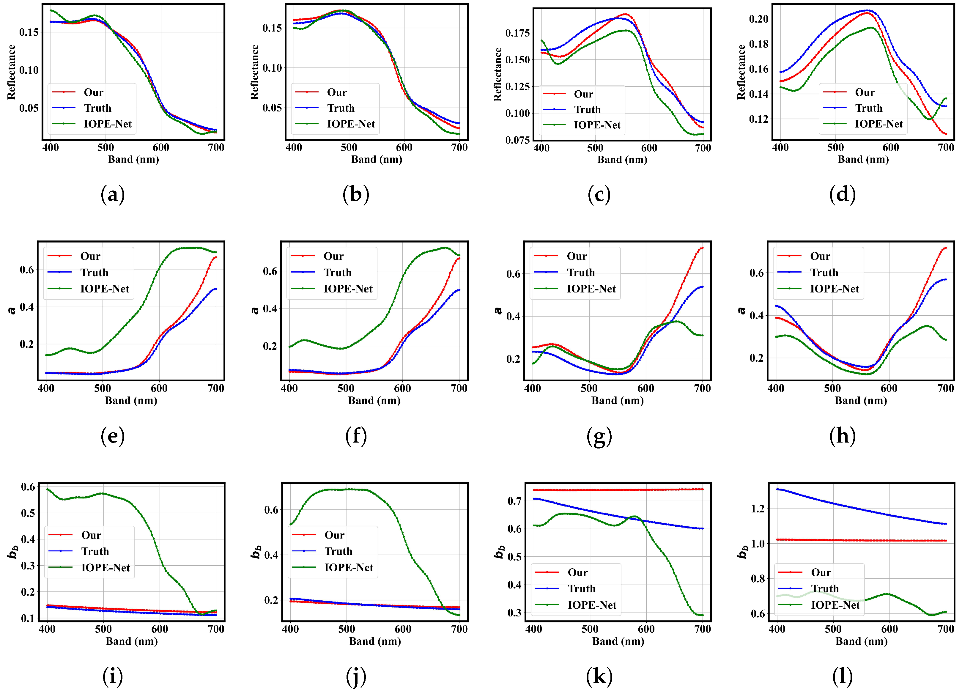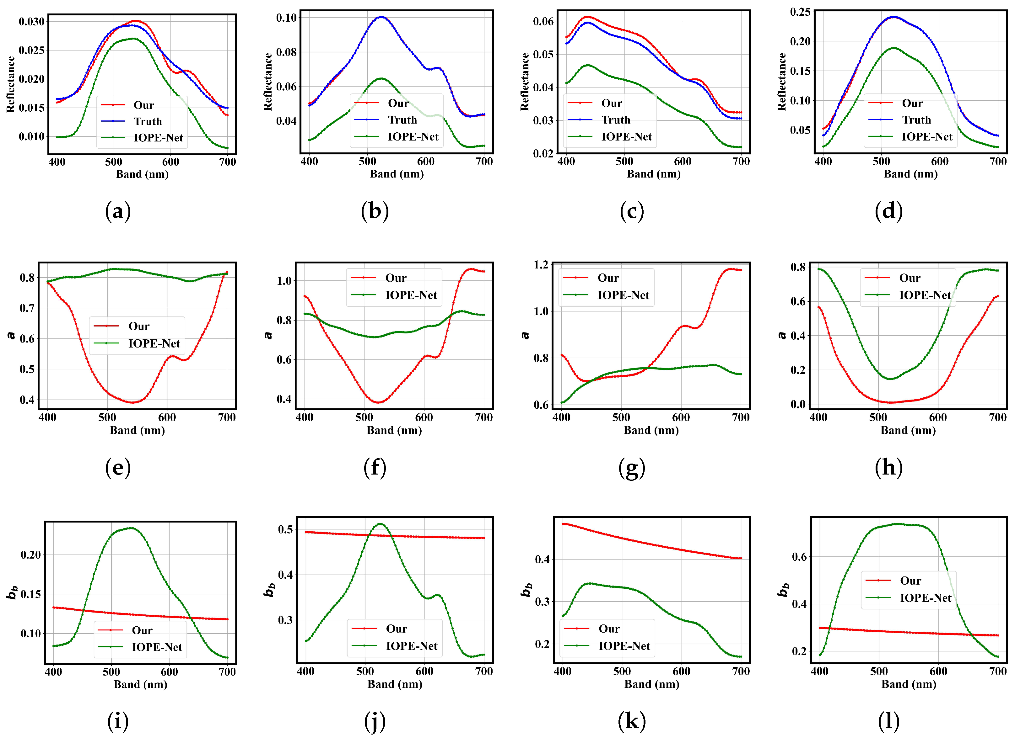 In addition to IOPE-Net, traditional empirical and semi-analytical approaches for water IOPs retrieval typically depend on prior knowledge of water type or fixed analytical models, limiting their adaptability and robustness in diverse optical conditions. While recent deep learning-based methods have demonstrated strong nonlinear fitting capabilities, they often suffer from a lack of physical interpretability, which can lead to unrealistic or unstable parameter estimations. Considering these limitations, IOPE-Net serves as a representative baseline of unsupervised IOPs estimation, whereas our proposed IOPE-IPD network aims to further integrate physical constraints into the data-driven framework to achieve both accuracy and interpretability in IOPs estimation.