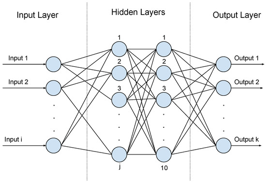 The main goal of this work was to define the smallest and simplest possible neural network architecture that could produce highly accurate SAR classification results. All network sizes that were tested had the base architecture shown in Figure 1. Each hidden layer is dense and uses ReLU as the activation function. In this diagram, i corresponds to the number of input neurons, k corresponds to the number of output neurons, and j is the number of neurons in the first hidden layer. The number of outputs depends on the conditions the network is for: SOC or EOC. The k value depends on the dataset used and corresponds to the output classes. The j value is the main focus of the network size experiments. Values between 60 and 20 were tested. By default, the i value is the size of a raw echo data sample in the dataset being used.