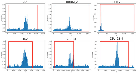 The first experiment to shorten the input size involved reducing the size of the input data by altering the start and length of the data window. The window reductions have a limit, as they must contain the most important part of the signal: the target. As an example for the MSTAR dataset, a window region of 1000–20,000 was determined to be suitable for all classes. This results in an input size of 19,000, a reduction in 6000 data values. Figure 2 displays plots of raw data from randomly selected samples of 6 classes. It also contains a square drawn in each plot corresponding to the window region of 1000–20,000. The peaks in the middle of each signal correspond to the targets. SLICY, the class with the shortest samples, has a target that barely fits in the defined window interval. The network was trained without weight initialization or dropout.