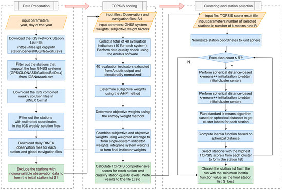 The station selection algorithm proposed in this paper is illustrated in Figure 1. It consists of three primary modules: (1) Data Preparation, (2) TOPSIS-based Quality Assessment, and (3) spherical k-means Clustering for Station Selection.