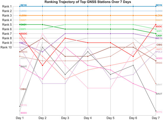 (8) Station Quality Classification. Finally, stations are classified into four quality levels based on their TOPSIS scores: Excellent (C ≥ 0.8), Good (0.6 ≤ C < 0.8), Fair (0.4 ≤ C < 0.6), and Poor (C < 0.4). The thresholds were derived empirically from the statistical distribution of the scores. Our analysis indicated that stations with scores above 0.8 generally exhibit high data integrity, whereas scores between 0.6 and 0.8 often signify missing data for a specific GNSS system or for a particular frequency within a system. This indicates that the TOPSIS score can serve as a preliminary diagnostic tool to identify potential issues in a station’s data.