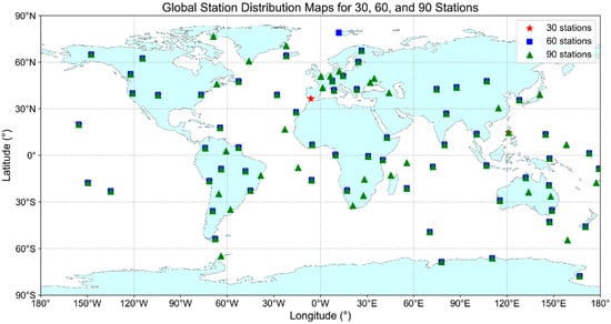 Several studies have proposed methods for optimal station selection based on geometric parameters to enhance the estimation of GNSS-based global parameters. Zhang et al. [2] investigated the impact of ground station geometry on precise orbit determination (POD) and proposed an optimization method based on discrete probability distribution. Wang et al. [3] introduced a method based on a minimum Orbit and ERP Dilution of Precision (OEDOP) criterion to rapidly select optimal station locations for orbit and Earth Rotation Parameter (ERP) determination. This approach was implemented using a combination of map grid zooming and heuristic techniques.