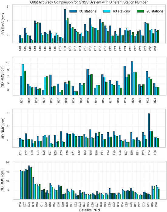 As the number of stations increases to 60 and especially to 90, the discrepancy in POD accuracy among networks composed of different quality-grade stations diminishes significantly. In the 90-station configuration, the POD accuracy for the GPS and Galileo constellations becomes virtually identical, regardless of whether the ‘best’- or ‘worst’-quality stations are used, with their RMS values being nearly the same. For the BDS constellation, although the ‘best’ network (5.23 cm) still outperforms the ‘worst’ (5.74 cm), the performance gap is substantially smaller than that observed in the 30-station case. The accuracies of the three network types for the GLONASS constellation also converge as the network size increases to 60 and 90 stations.