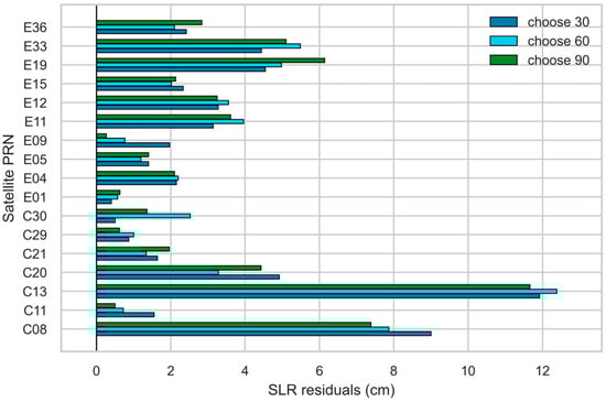 SLR validation results for the 30-, 60-, and 90-station networks composed of stations with different data qualities. The x-axis represents the magnitude of the SLR residuals (cm), and the y-axis indicates the satellite PRN.