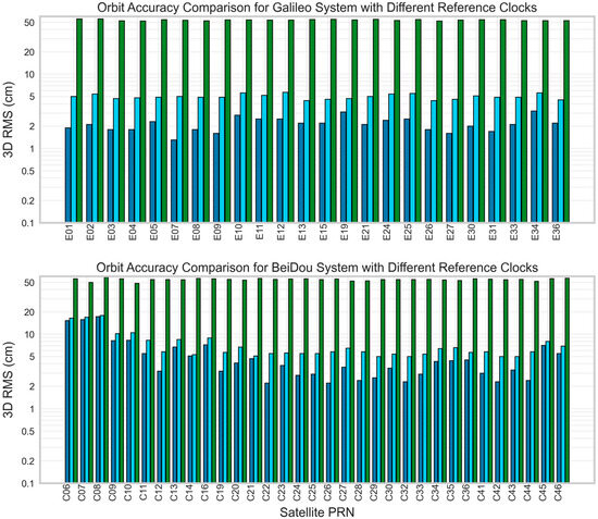 As shown in Figure 7, POD accuracy for all constellations achieved optimal levels when PTBB was selected as the reference clock. In contrast, switching the reference clock to TID1 resulted in a noticeable degradation of orbit accuracy across all systems. The average RMS for GPS and Galileo degraded to approximately 5 cm, effectively halving their precision. GLONASS and BDS also exhibited a similar degradation trend, indicating that the clock performance of TID1 station was inferior to that of PTBB during this processing period. A severe deterioration in POD results was observed when HOB2 was used as the reference clock, with the orbit RMS values for all systems increasing to over 50 cm.