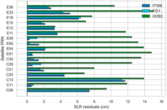 The SLR residual validation results, shown in Figure 8, also underscore a similar issue. When HOB2 was selected as the reference clock, all satellites showed significantly larger SLR residuals, generally exceeding 10 cm, which is consistent with the results from the orbit RMS comparisons. It is noteworthy that the radial accuracy achieved with PTBB and TID1 as reference clocks is comparable. Although the 3D orbit RMS for TID1 as the reference clock was poorer than for PTBB, their respective SLR residuals remained at a similar level. For most Galileo and BDS MEO satellites, the SLR residuals in both scenarios were within the 1–4 cm range, showing minimal differences. This indicates that while the orbits derived from the two scenarios might exhibit systematic biases in their reference frames (leading to differences in 3D RMS), their absolute radial accuracies are in fact comparable. Despite TID1 also achieving orbits with high radial accuracy, the results obtained using PTBB as the reference clock showed superior consistency with the CODE final orbits in terms of reference frame. This consistency explains our choice of PTBB as the reference clock for all orbit determination solutions presented in Section 3.