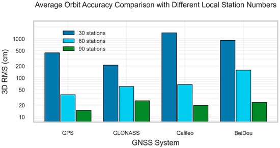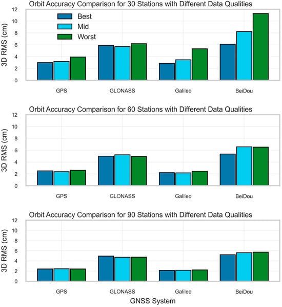 Average orbit RMS for each constellation using the 30-, 60-, and 90-station networks composed of ‘best,’ ‘mid,’ and ‘worst’ quality stations. The y-axis represents the average RMS error in centimeters (cm).