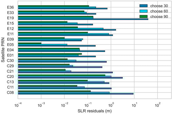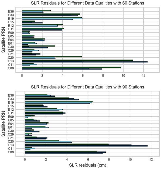 The results from the SLR validation are consistent with the orbit RMS comparisons. For the more challenging IGSO satellites (e.g., C08, C13), the SLR residuals from the ‘worst’-quality network were in the range of 17–18 cm, compared to 9–12 cm for the ‘best’ network. Similarly, for certain Galileo satellites like E04, the SLR residuals deteriorated from 2.2 cm to 6.0 cm. This demonstrates that when observational redundancy is low, the data quality of individual stations has a pronounced effect on the overall solution. In this context, the TOPSIS-based quality assessment and selection strategy employed in this study is a critical component for ensuring high POD accuracy.
