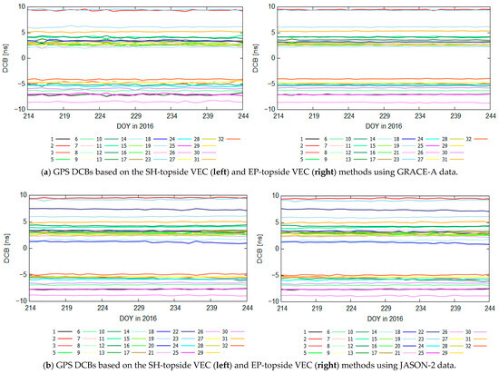 The daily GPS satellite DCB estimates based on the EP-topside VEC and SH-topside VEC methods are shown in Figure 1, where the GPS DCB estimates range between −10 and 10 ns. They are relatively stable and have small differences. DCB values for G04, G20, and G22 using GRACE-A data were not estimated due to a lack of observations. In Figure 1a, the time series of the GPS DCB estimates with GRACE-A data using the EP-topside VEC method are slightly smoother than those using the SH-topside VEC method. In Figure 1b, there is no significant difference between the time series of GPS DCBs with JASON-2 data using the two VEC methods.