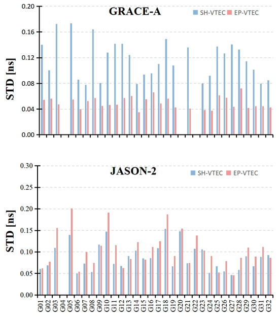 The STD for the differences between the sum TEC of LEO-topside VEC and IRI 2016, and the CODE GIM, during August 2016, are depicted in Figure 11. The STD values of the differences between the sum TEC of the LEO-based topside VEC and IRI VTEC and the CODE GIM fluctuate below 5 TECU. For GRACE-A, the STDs of the differences using the EP-topside VEC method are better than those using the SH-topside VEC method. According to statistics, the STD means of the SH-topside VEC and EP-topside VEC methods for GRACE-A using the IRI-GIM validation method are 4.2 and 2.2 TECU, respectively. There is a roughly 2 TECU difference between the two VEC methods in the verification results of GRACE-A-topside VECs. Additionally, there appear to be some differences in the mean of GRACE-A DCB estimates between the two methods in Table 4. Although the IRI is an empirical climatological model and it has model and prediction errors [42], these results also seem to have a certain degree of self-consistency. This further demonstrates that, compared to the GNSS satellite DCB, the two LEO-topside VEC processing methods have a greater impact on the stability of the LEO-topside VEC and LEO DCB estimates. For JASON-2, the two LEO-based topside VEC modeling methods have similar STD results, and the STD means using the two VEC methods are 2.9 and 2.6 TECU, respectively. In summary, for GRACE-A, the validation results using the EP-topside VEC method are superior to those using the SH-topside VEC method, while for JASON-2, the two VEC methods have similar validation results.