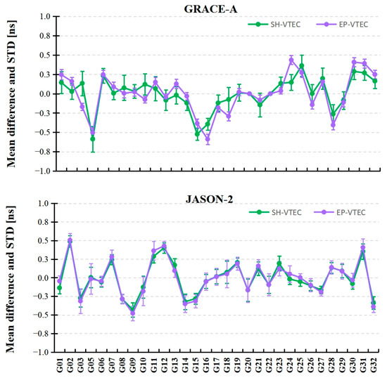 Mean and STD results of the difference between GPS DCB estimates and CODE products using data from GRACE-A and JASON-2 satellites during August 2016. Green and purple dots denote the SH-topside VEC and EP-topside VEC methods, respectively.