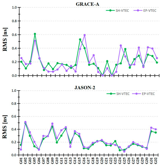 Daily CODE DCB products were used as reference products for external evaluation [1,8]. The mean and STDs of the differences between GPS DCB values estimated using the two modeling methods and CODE products for two LEO satellites are depicted in Figure 3. Figure 4 and Table 3 show the corresponding RMS and RMS mean values of GPS DCBs using the two methods. In Figure 3, the mean differences between GPS DCB estimates and CODE products range between −0.6 and 0.6 ns. The variation range in the mean differences between GPS DCB estimates and CODE products using JASON-2 data is less than that using GRACE-A data. The STDs of differences compared with CODE products using the SH-topside VEC and EP-topside VEC methods are within 0.16 and 0.20 ns, respectively, and mean STDs are all within 0.11 ns. The RMS values of the difference between the GPS DCB estimates and CODE products are mostly below 0.6 ns. According to statistics in Table 3, the RMS means of the difference between GPS DCB estimated using the SH-topside VEC method and CODE products for GRACE-A and JASON-2 data are 0.219 and 0.241 ns, respectively, while those obtained using the EP-topside VEC method for two LEOs are 0.221 and 0.256 ns, respectively. These results illustrate that the RMS values of GPS DCB estimates using the SH-topside VEC method are slightly better than those obtained using the EP-topside VEC method.