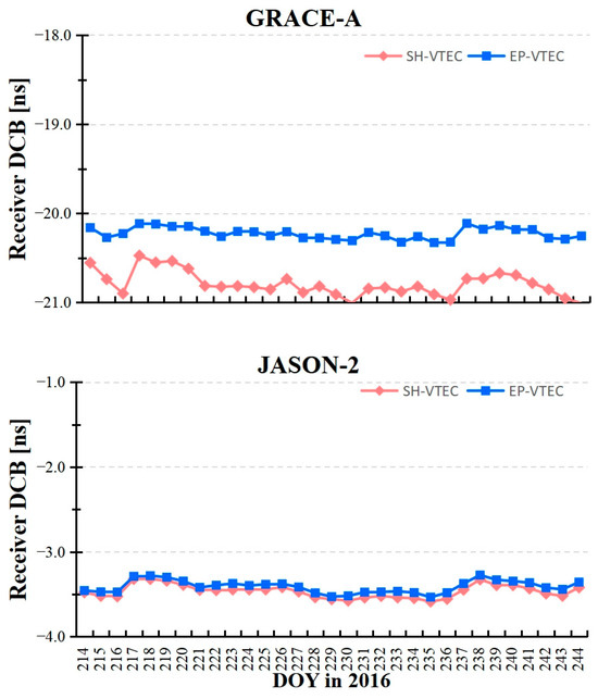 Based on the aforementioned results, this section only presents the LEO receiver DCB estimates. The time series of LEO receiver DCBs with the SH-topside VEC and EP-topside VEC methods using GRACE-A and JASON-2 data are displayed in Figure 5, and Table 4 presents the mean values and STD results for two LEO receiver DCB estimates using two VEC methods. Figure 5 shows that the differences between GRACE-A DCB estimates using the two modeling methods are within 1.0 ns, while the corresponding JASON-2 DCB values are similar to each other for the two methods. The statistics presented in Table 4 show that the differences in LEO receiver DCB means between the two methods are 0.567 and 0.034 ns for the two LEOs, respectively. There appears to be a difference of 0.5 ns in the mean of GRACE-A DCB estimates between the two methods. As the other factors are the same under the two methods, the main reason remains the difference in the LEO-topside VEC processing methods. Compared to the GPS satellite DCB estimates, the LEO-topside VEC has a greater impact on the LEO receiver DCB estimates. The STD results of GRACE-A and JASON-2 receiver DCBs using the SH-topside VEC and EP-topside VEC method are 0.138 and 0.065 ns and 0.078 and 0.075 ns, respectively. These results illustrate that GRACE-A receiver DCBs derived from the EP-topside VEC method are more stable than those obtained from the SH-topside VEC method, whereas JASON-2 receiver DCBs have similar results for the two VEC methods.