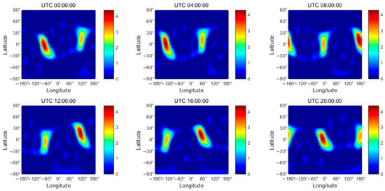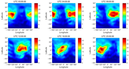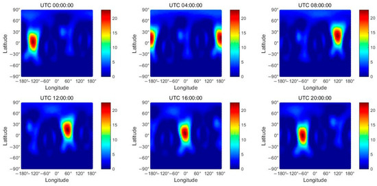 Figure 6 and Figure 7 depict the actual estimated LEO-based topside VEC results using the two methods. In addition, the VEC model map results can be displayed. We must note that the EP-topside VEC method cannot present the VEC model map, as its VEC is estimated as epoch parameters directly rather than being modeled. In contrast, the SH-topside VEC method models the VECs, and its VEC model maps can be displayed. Thus, we only present the VEC model maps of the SH-topside VEC method, which has high-resolution spatiotemporal characteristics. In Figure 8, Figure 9 and Figure 10, we show the CODE GIM, GRACE-A-topside, and JASON-2-topside VEC model maps with 4 h cadence on DOY 214 in 2016, respectively. Therefore, each map has six different subfigures corresponding to different UTCs. Similar to Figure 6, Figure 9 also exhibits the EIA phenomenon. Figure 10 is similar to Figure 7, but due to the higher orbits of JASON-2, its EIA phenomenon is not significant. In Figure 9, the peak positions and TEC distributions of GRACE-based GIM and CODE GIM are similar on DOY 214 due to the low orbit of the GRACE satellite. And the peak differences between GRACE-based GIM and CODE GIM are about 10 TECU. In Figure 10, the peak positions of JASON-2-topside VEC maps differ from those of the GRACE-A-topside VEC and CODE GIM maps, and there are two peaks in the JASON-2-based VEC on DOY 214. This two-peak phenomenon in the JASON-2-topside VEC maps is temporary and may be related to the amount of data. We can roughly compare Figure 6 (JASON-2 on the right) and Figure 10. Figure 6 and Figure 10 show the actual extracted VECs for one month and the model maps for one day using the SH-topside VEC method, respectively. In the case of a small amount of data, the result of Figure 10 may temporarily show two peaks. When using one month of data, it becomes like Figure 6. And we noted that the longitudinal widths of the LEO-topside VECs are smaller than those of the CODE GIM, which is also related to the amount of data and satellite orbit altitude. We displayed the model maps of SH-topside VEC for one day; the results for Figure 6 (using one month of data) are much better. Even though they are both LEO satellites, the higher JASON-2 orbit leads to a smaller VEC, whose widths are also not as good as GRACE VECs. In addition, we believe the main reason for the different peak positions in Figure 9 and Figure 10 is the higher orbits of JASON-2 (at 1350 km) and smaller VECs (≤5 TECU), which leads to the JASON-based VECs not following the characteristics and distribution of ground-based TEC. In contrast, the similarity of VEC distributions between GRACE-based GIM and CODE GIM is higher than that of JASON-2-based GIM due to the lower LEO orbits (only 400 km in 2016). Hence, to some extent, the GRACE-based VECs follow the characteristics and distribution of ground-based TECs. These results indicate that the LEO-topside VECs and EIA may have different altitude structures.