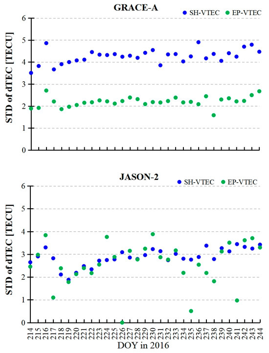 STD for differences between the summed TEC of the LEO-based topside VEC and International Reference Ionosphere (IRI) 2016 model, and the CODE GIM, using GRACE-A and JASON-2 data during August 2016. The blue and green dots represent the STDs of differences using the SH-topside VEC and EP-topside VEC methods, respectively.