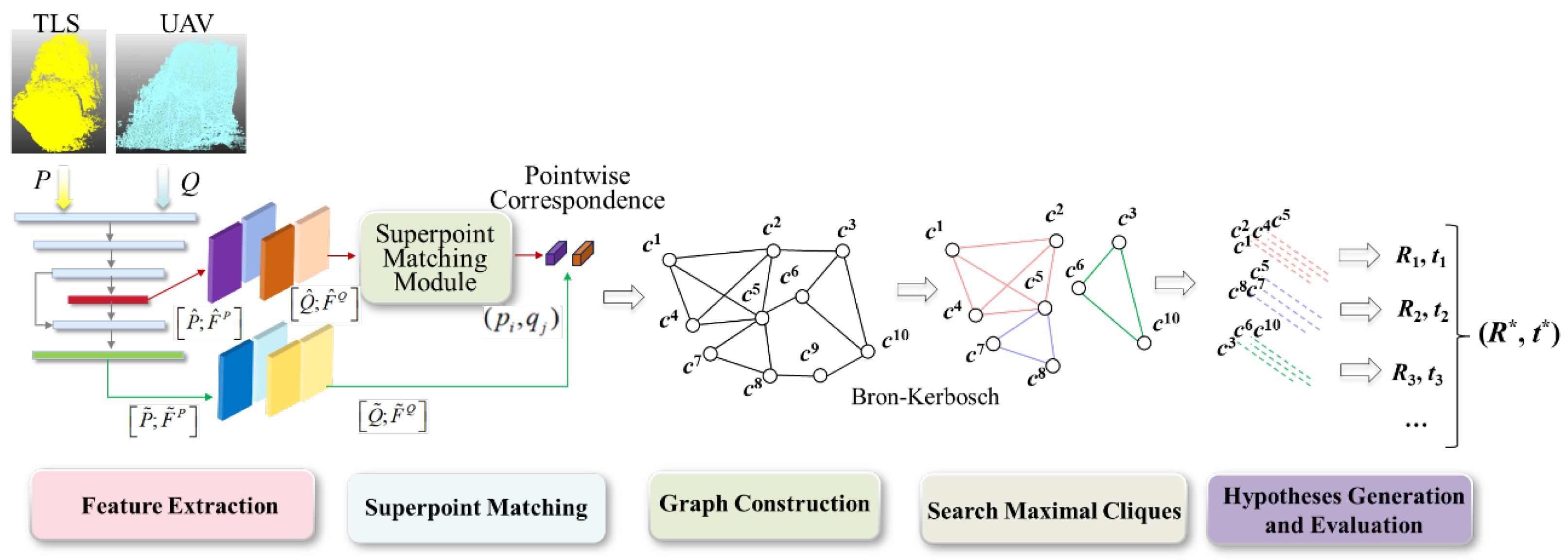 - Yang, J.; Zhang, X.; Wang, P.; Guo, Y.; Sun, K.; Wu, Q.; Zhang, S.; Zhang, Y. MAC: Maximal Cliques for 3D Registration. IEEE Trans. Pattern Anal. Mach. Intell. 2024, 46, 10645–10662. [Google Scholar] [CrossRef]