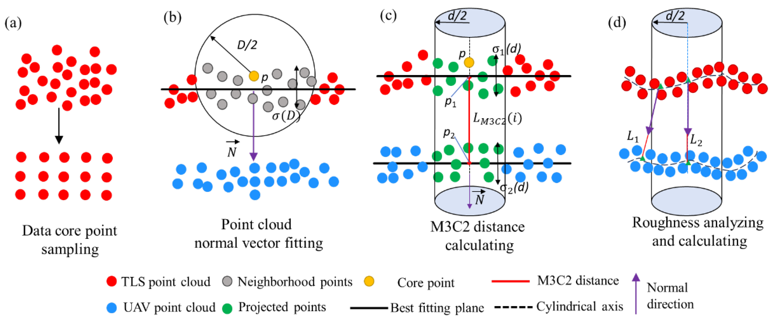 - Roughness analyzing and calculating: To mitigate the influence of random errors, a confidence interval is established to determine the Least Significant Change Distance (LoD). Assuming that the errors follow an independent Gaussian distribution, the following formula can be applied for testing when the number of intersection points n1 and n2 is greater than or equal to 30 (Equation (12)):where LOD (d) represents the least significant change distance under the projection radius d/2; σ1 and σ2 denote the roughness of the TLS and UAV point clouds, respectively, under the projection radius d/2; n1 and n2 are the numbers of core points in the respective point clouds; reg represents the error of point cloud registration.