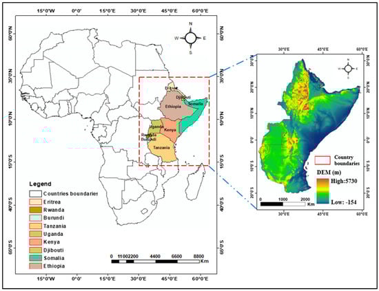 The study area encompasses the Eastern African region, including Djibouti, Eritrea, Rwanda, Burundi, Tanzania, Kenya, Uganda, Somalia, and Ethiopia (Figure 1). Geographically, this region lies approximately between 15°N and 12°S latitude, and 30°E and 52°E longitude, covering an area of approximately 4 million square kilometers. This region is characterized by diverse landscapes and climatic zones, ranging from arid lowlands to tropical highlands. The climate is primarily tropical, with significant variations due to topography. Eastern Africa has two primary rainfall seasons: the “long rains” from March–May and the “short rains” from October–December [23,24]. Annual rainfall ranges from less than 200 mm in arid areas to over 2000 mm in highlands, with mean annual temperatures varying from 10 °C in the highlands to 30 °C in the lowlands. The region’s agricultural landscape is diverse, including the highlands of Ethiopia, Kenya, and Tanzania, known for coffee, tea, and horticulture; the Lake Victoria basin, supporting mixed crop-livestock systems; and semi-arid regions where pastoralism and drought-resistant crops like sorghum and millet are common. The topography is marked by the East African Rift System, featuring notable landmarks such as Mount Kilimanjaro, Mount Kenya, and the Danakil Depression. This varied geography and climate make Eastern Africa particularly vulnerable to agricultural drought, underlining the importance of accurate and timely drought monitoring systems. Overall, the study area focuses on the socio-ecological system of Eastern Africa, with a specific focus on agricultural drought vulnerability.