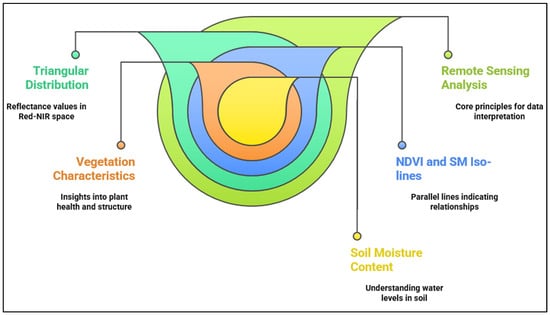 Figure 2 visually represents key components related to remote sensing analysis, focusing on the relationships between spectral reflectance values, vegetation characteristics, NDVI, and soil moisture [27,28,29]. At its core, the diagram emphasizes remote sensing analysis as the foundation for interpreting data. The triangular distribution, highlighted in green, illustrates the reflectance values in the Red-NIR spectral space and signifies its importance in analyzing the interplay between these two spectral bands. Adjacent to this, the section marked in orange represents vegetation characteristics, demonstrating how insights gained from the triangular distribution contribute to understanding plant health and structure. The blue segment focuses on NDVI and soil moisture (SM) iso-lines, showing how NDVI values correlate with varying soil moisture levels, with parallel lines indicating consistent relationships across these parameters. Lastly, the yellow area emphasizes soil moisture content, highlighting its significance in relation to both plant health and soil dynamics. The flowing color scheme throughout the figure illustrates the interconnectedness of these concepts, making the complexities of remote sensing analysis more accessible. The Normalized Difference Vegetation Index (NDVI) is computed using Equation (1) below.