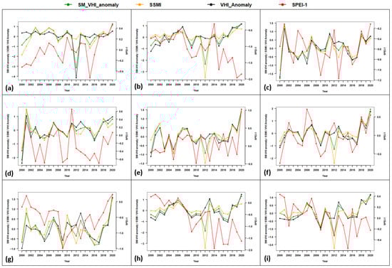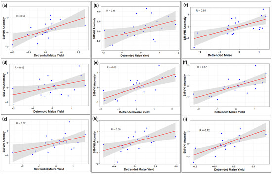 SM-VHI anomaly and detrended maize yield correlation for validation in East Africa: (a) Djibouti, (b) Eritrea, (c) Rwanda, (d) Burundi, (e) Tanzania, (f) Kenya, (g) Uganda, (h) Somalia, (i) Ethiopia.
