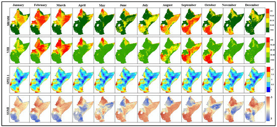 Spatial distribution maps of monthly SM-VHI, VHI, SPEI-1, and SSMI from 2000 to 2020.