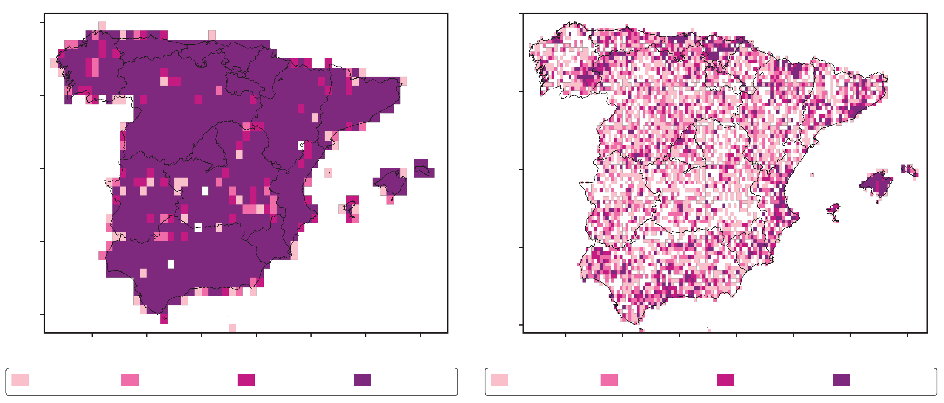 Figure 6. Pixel-wise density of gauges associated to the employed AEMET dataset for 0.25° and 0.1° lat-lon resolutions.