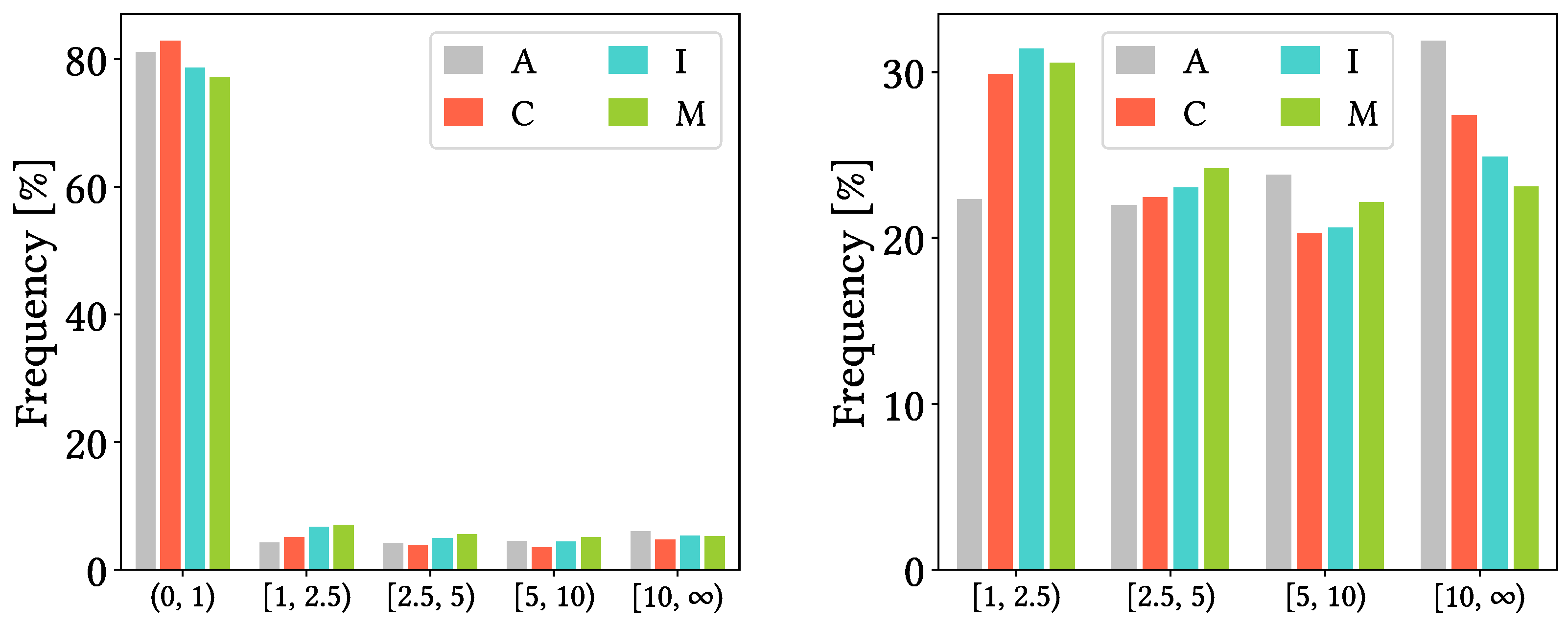 Figure 8. Probability density functions of precipitation grouped by approximate reference quartiles (in mm   day 1 ) for reference AEMET dataset (A), CMORPH V1.0 (C), IMERG V07A (I) and MSWEP V2.8 (M). Left figure includes dry days to cover all data, while right figure excludes them for focusing on wet days. Plots are inspired in those found in chino [45].
