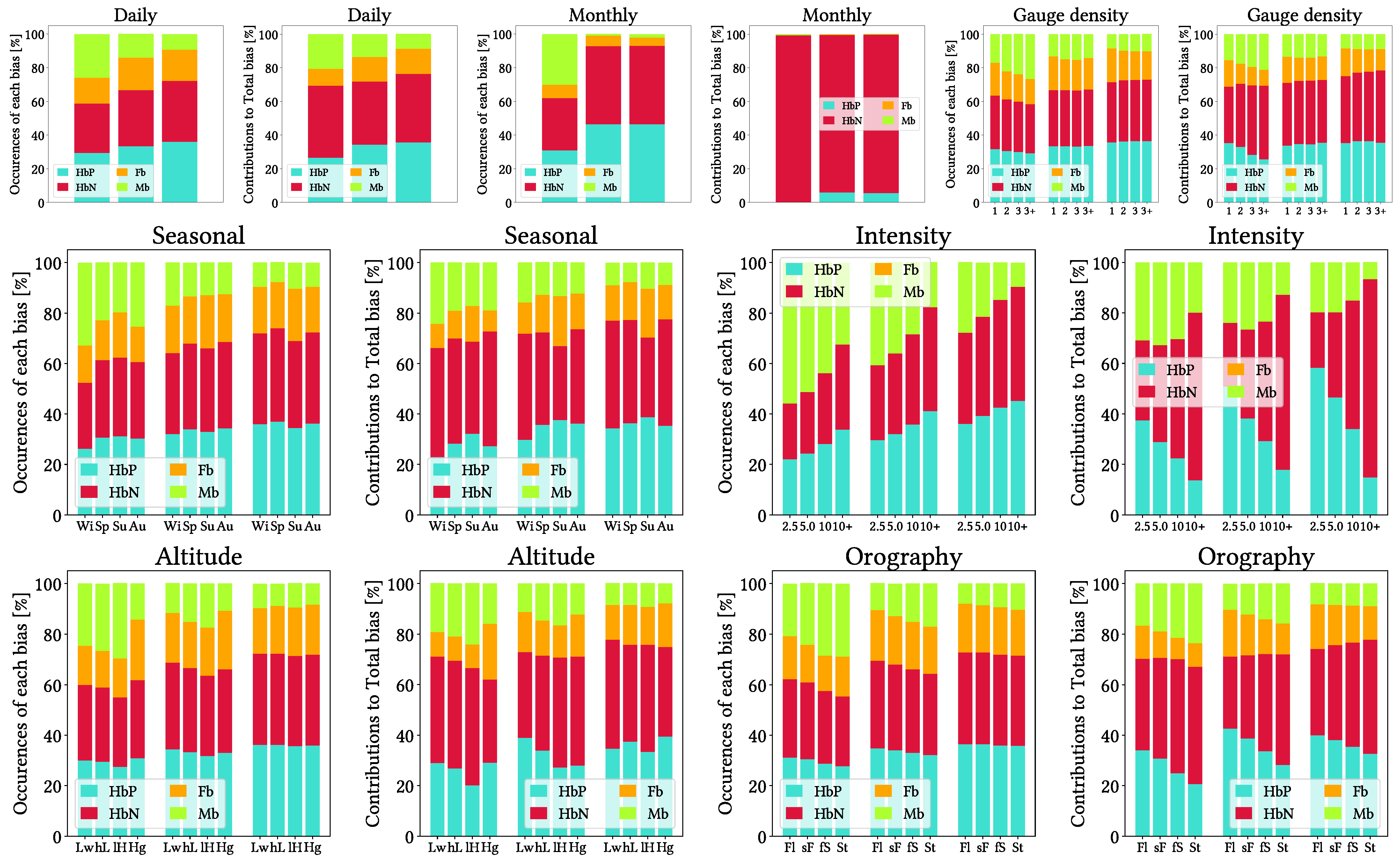 Figure 9. Stacked bars charts for absolute value contributions of each type of bias (Positive Hit bias, Negative Hit bias, False bias and Miss bias) to Total bias and for ratios of occurrences (reports of any gauge and any day) of each type of bias to the total of bias occurrences. In each chart, left bars correspond to CMORPH V1.0, middle ones to IMERG V07A and right ones to MSWEP V2.8. For intensity grouping, labels indicate median quartiles across all pixels (in mm   day 1 ).