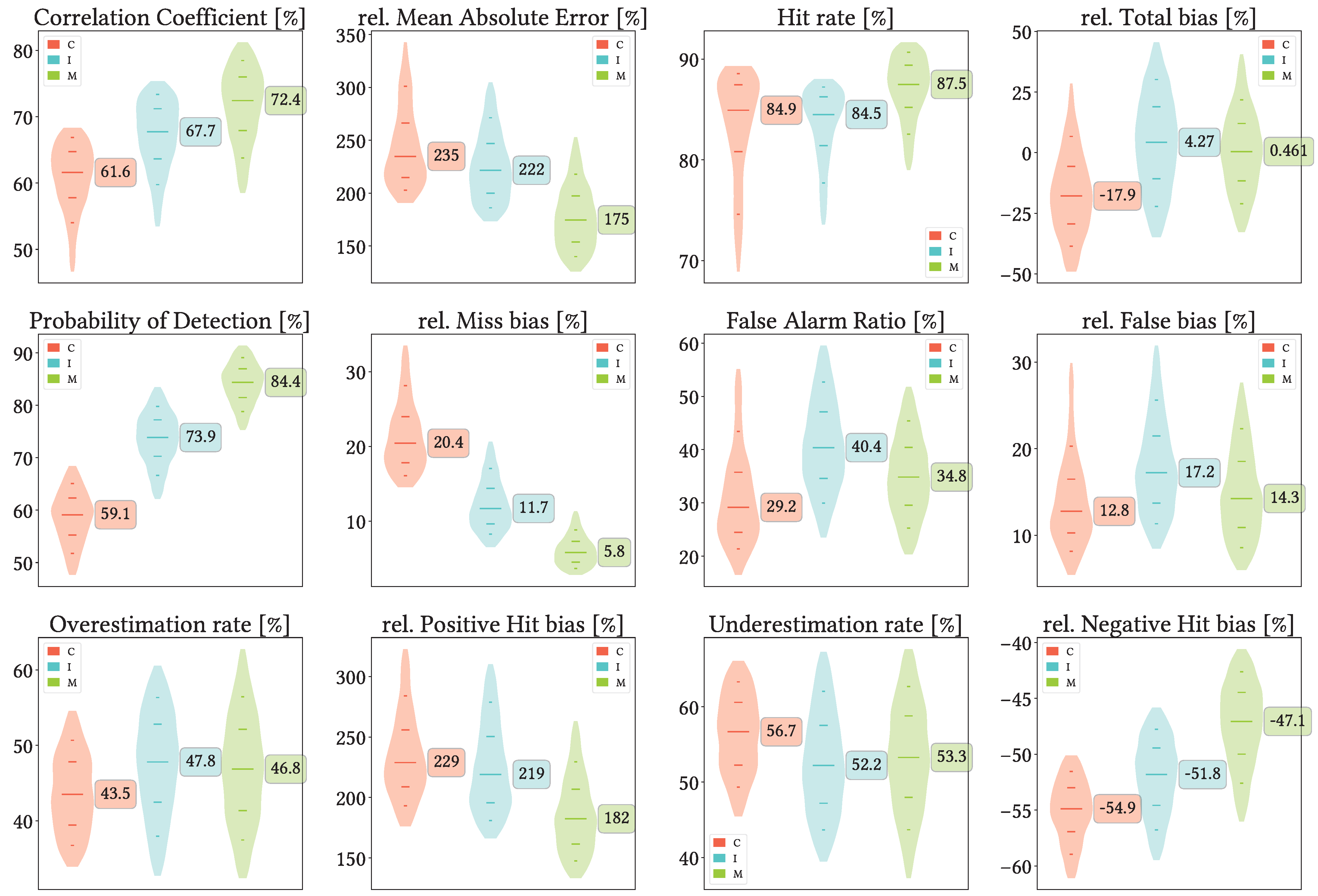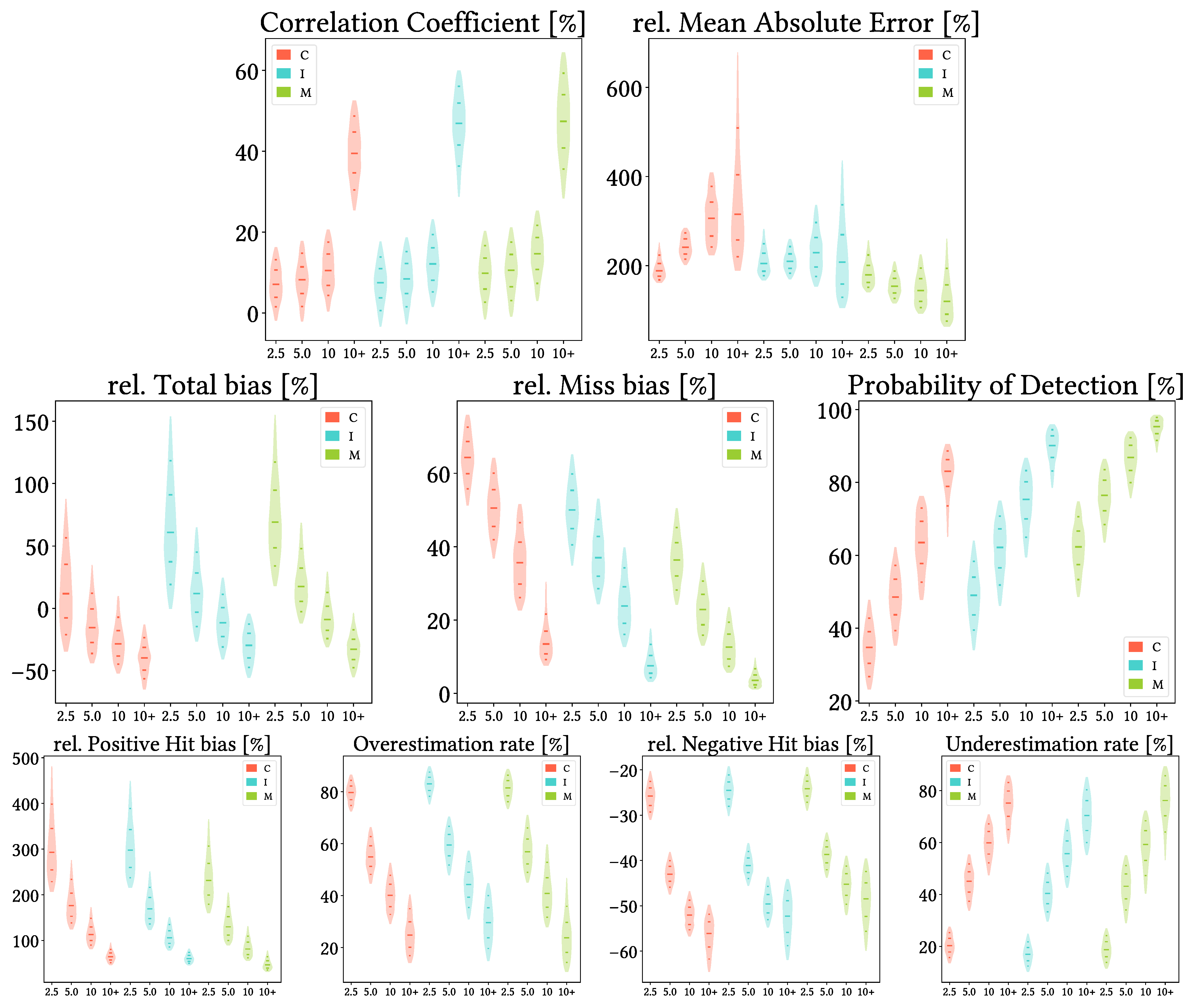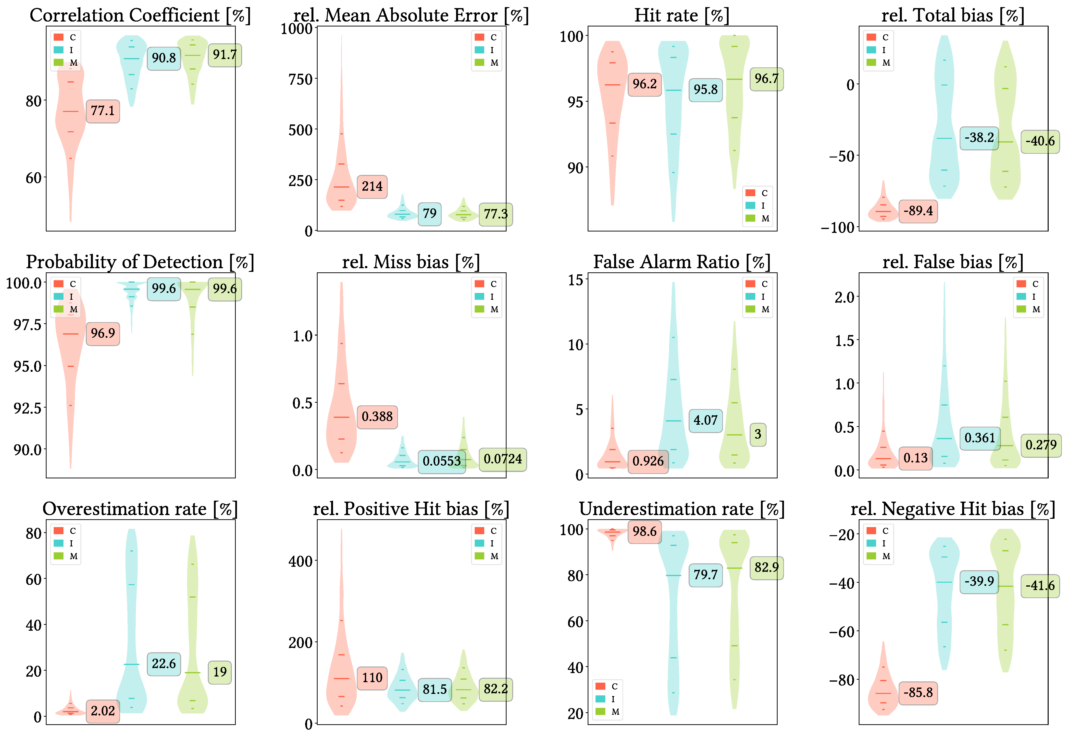 Figure 14. Violin plots from the pixel-wise evaluation indices and error components for CMORPH V1.0 (C), IMERG V07A (I) and MSWEP V2.8 (M) versus AEMET ground gauges across the 2001–2020 period at monthly resolution without any grouping. Values range from 5th to 95th percentiles for better clarity. Stripes indicate 10th, 25th, 50th, 75th and 90th percentiles. Median value is explicitly shown.