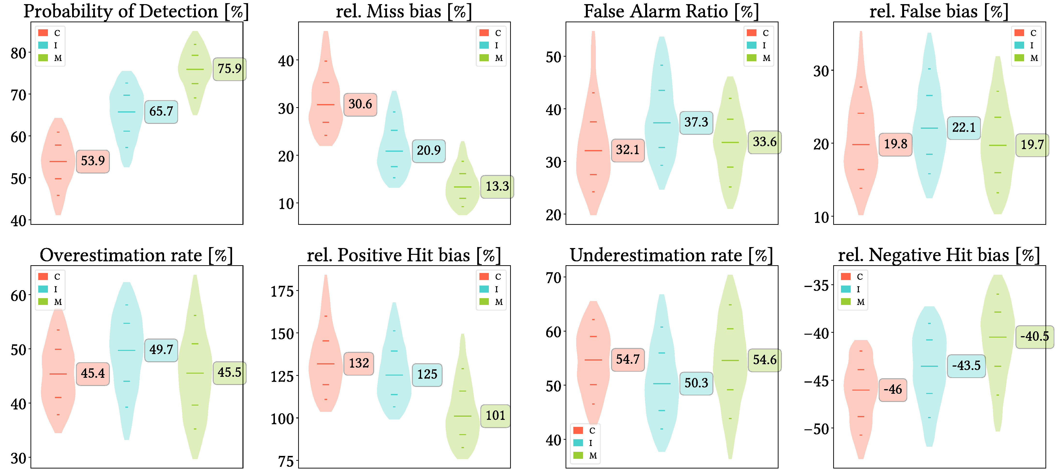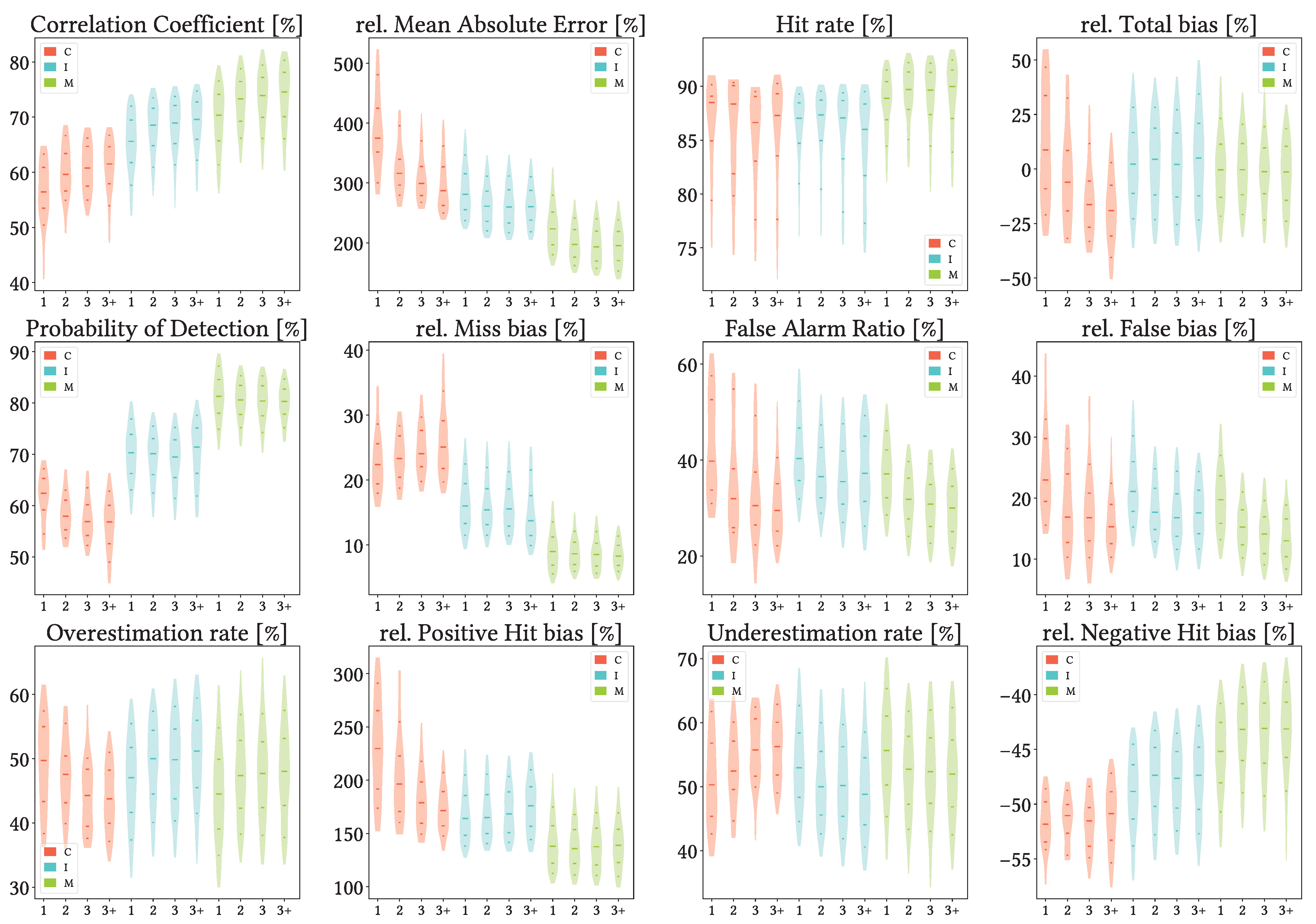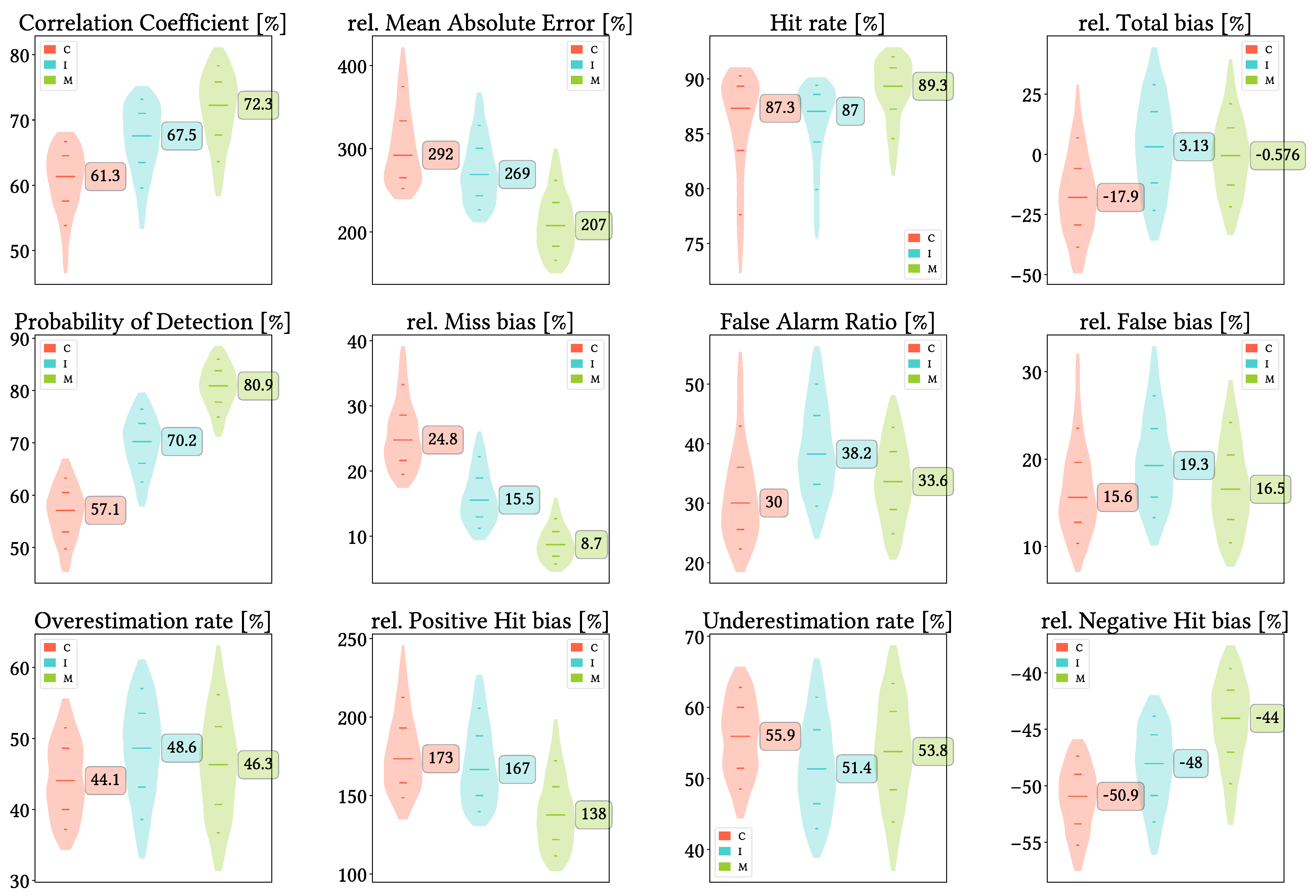 Figure 14. Violin plots from the pixel-wise evaluation indices and error components for CMORPH V1.0 (C), IMERG V07A (I) and MSWEP V2.8 (M) versus AEMET ground gauges across the 2001–2020 period at monthly resolution without any grouping. Values range from 5th to 95th percentiles for better clarity. Stripes indicate 10th, 25th, 50th, 75th and 90th percentiles. Median value is explicitly shown.