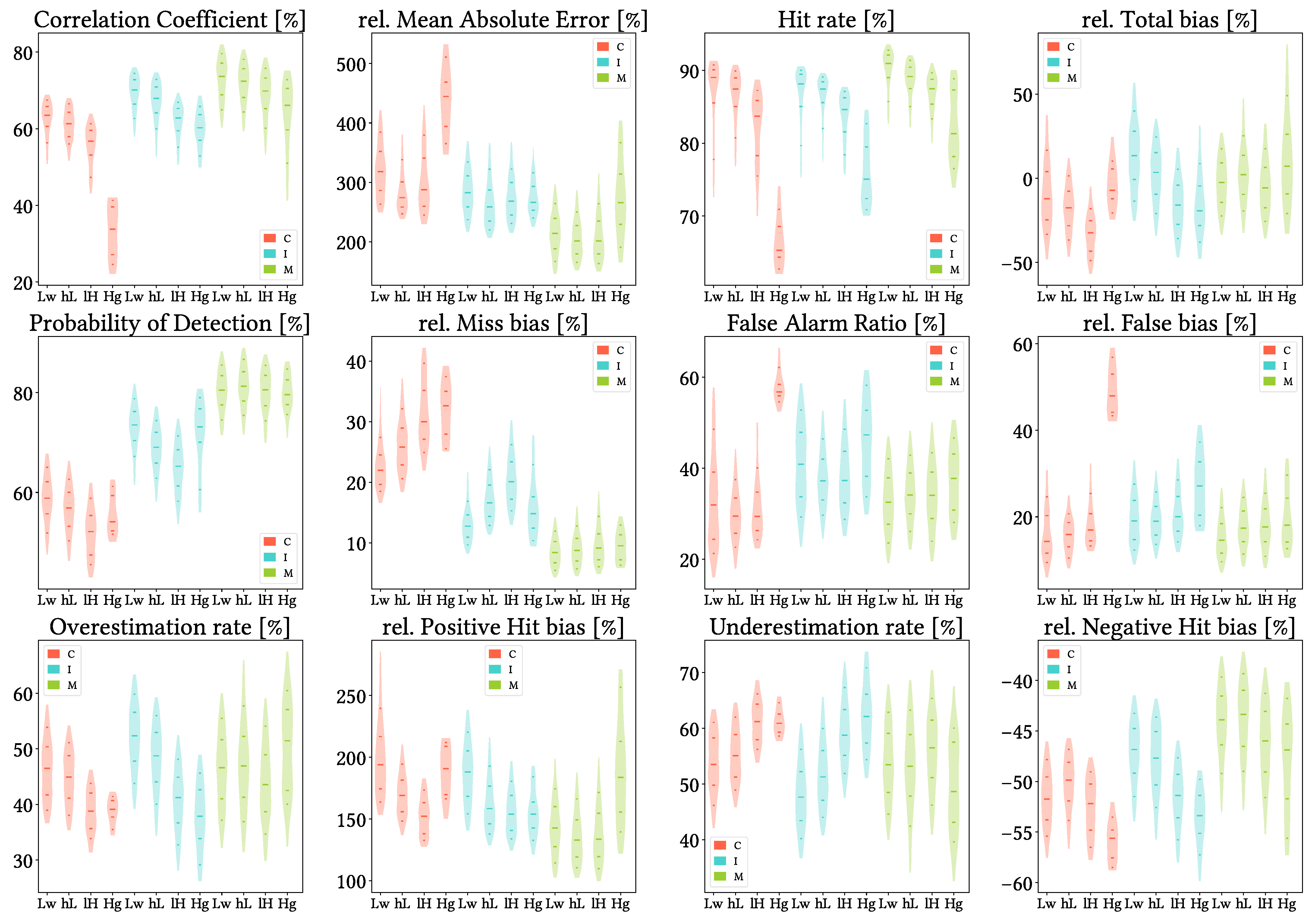 Figure 17. Violin plots from the pixel-wise evaluation indices and error components for CMORPH V1.0 (C), IMERG V07A (I) and MSWEP V2.8 (M) versus AEMET ground gauges across the 2001–2020 period at daily resolution and grouping by SRTM-based altitude intervals (Lw: Low, hL: higher-Low, lH: lower-High, Hg: High; see Section 4.3). Values range from 5th to 95th percentiles for better clarity. Stripes indicate 10th, 25th, 50th, 75th and 90th percentiles.