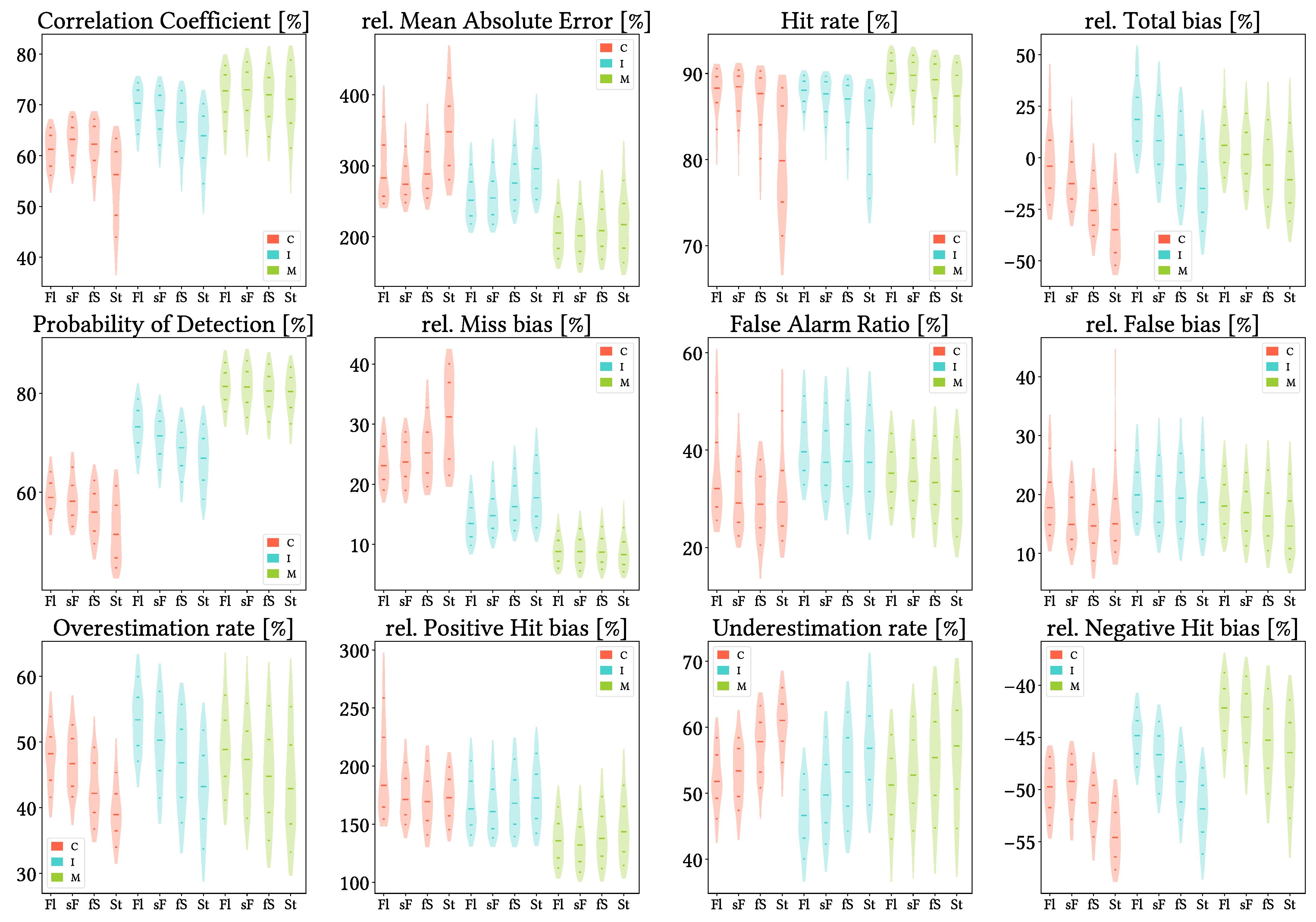 Figure 18. Violin plots from the pixel-wise evaluation indices and error components for CMORPH V1.0 (C), IMERG V07A (I) and MSWEP V2.8 (M) versus AEMET ground gauges across the 2001–2020 period at daily resolution and grouping by SRTM-based TRI intervals (Fl: Flat, sF: stepper-Flat, fS: flatter-Steep, St: Steep; see Section 4.3). Values range from 5th to 95th percentiles for better clarity. Stripes indicate 10th, 25th, 50th, 75th and 90th percentiles.