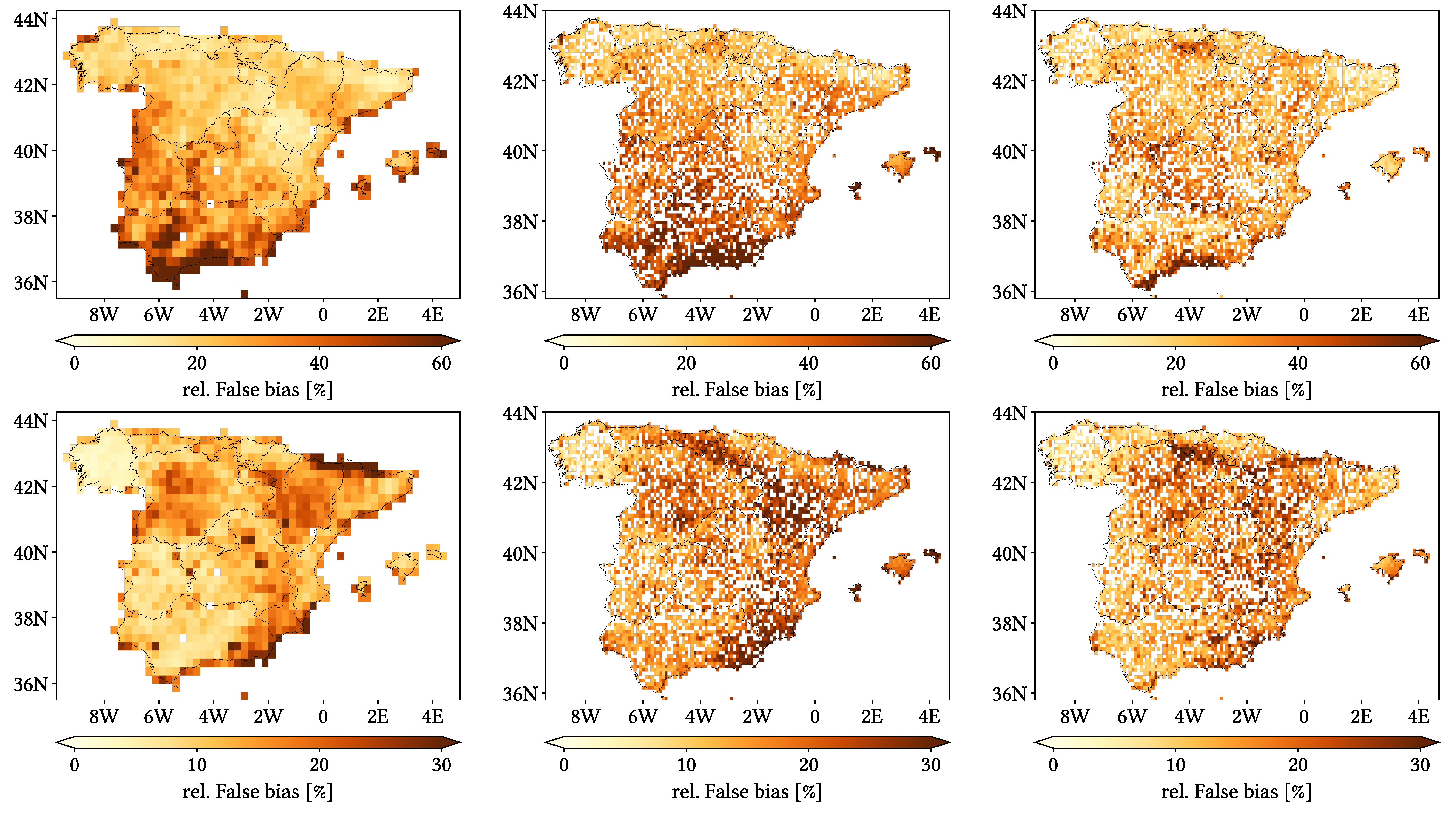 Finally, all types of bias (both the original definitions from [43] and our definitions) lose information about how probably an event will present one or another type of bias. Fortunately, the categorical metrics used in this study inform about that: the probability of finding False bias is given by the FAR metric, while that of finding Miss bias is given by the complementary of POD (i.e., 1 P O D ). Equivalently, the probability of occurring Positive (Negative) Hit bias is represented by the Overestimation (Underestimation) rate.