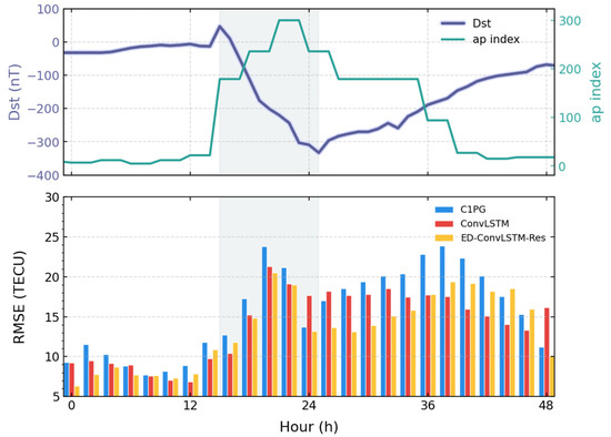 Figure 3 depicts the evolution of Dst and the ap index from 10 to 11 October 2024 (minimum Dst = −333 nT) and compares the 2 hourly RMSE of ED-ConvLSTM-Res, ConvLSTM, and c1pg over the storm interval. As the storm’s main phase develops, the errors of all three models increase. Nevertheless, ED-ConvLSTM-Res attains the lowest RMSE of 13.75 TECU, representing a 4.7% reduction relative to ConvLSTM with 14.43 TECU and a 4.9% reduction relative to c1pg with 14.46 TECU. The improvement is most evident during the storm’s main phase, highlighting the model’s enhanced storm-time prediction capability.