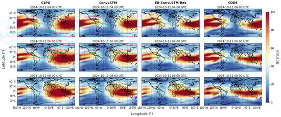 Figure 4 presents the prediction results from the ED-ConvLSTM-Res and ConvLSTM models, along with the GIMs released by CODE and the corresponding ground truth observations. The time points UT 04:00, 06:00, and 08:00 correspond to hours 28, 30, and 32 in Figure 3, respectively. It is evident that the ED-ConvLSTM-Res model produces TEC forecasts that are more accurate and closer to ground-truth measurements compared to both the ConvLSTM model and the operational c1pg product. The model successfully captures the TEC enhancement around the latitudinal band of approximately 30°S–20°N on the dayside, a feature that is not well represented in the c1pg or ConvLSTM predictions. A quantitative evaluation based on Formula (8) shows that on 11 October 2024, the c1pg model achieved an RMSE of 19.27 TECU, while the ConvLSTM model achieved a lower RMSE of 16.76 TECU, and the ED-ConvLSTM-Res model achieved an RMSE of 16.15 TECU. Furthermore, under geomagnetically quiet conditions, the ED-ConvLSTM-Res model’s predictions were closer to the measured values, indicating that the forecast performance of the c1pg, ConvLSTM and ED-ConvLSTM-Res models decrease with increasing geomagnetic storm intensity.
