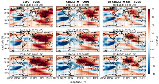 In this section, we assess the accuracy of the proposed ED-ConvLSTM-Res model by comparing its forecasts with those from c1pg, ConvLSTM, and the CODE analysis fields (used here as ground truth). The c1pg product denotes CODE’s official 1-day global TEC forecast, obtained by extrapolating spherical harmonic (SH) coefficients [28].