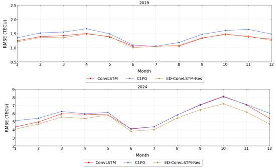 The RMSE values averaged over each month of TEC prediction by ED-ConvLSTM-Res compared with c1pg and ConvLSTM in 2019 (low solar activity year) and 2024 (high solar activity year).