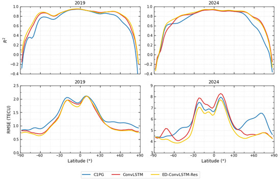 Figure 7 illustrates the variation in RMSE and R2 with latitude for the datasets from 2019 and 2024. Notably, the ED-ConvLSTM-Res model consistently exhibits the lowest error across latitudes. It can be observed that the ED-ConvLSTM-Res model outperforms both the c1pg product and the ConvLSTM model, particularly in the mid-latitude regions. All three prediction results display a pronounced latitude-dependent pattern in RMSE, which is likely associated with the equatorial ionization anomaly (EIA). Furthermore, the errors in the year 2024, a period of elevated solar activity, are generally higher than those observed during the lower solar activity year of 2019. The ED-ConvLSTM-Res model attains the highest R2, indicating that it explains the largest share of the variance in observed TEC. The higher R2 also implies smaller unexplained residual variance and superior skill in tracking TEC variability across latitude.