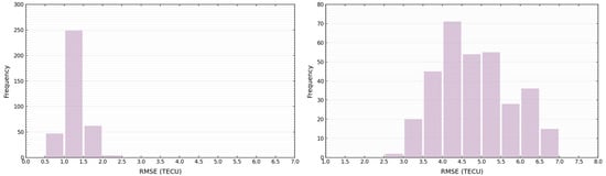 We assessed 1-day-ahead ionospheric TEC prediction errors over the entire test set using the trained model. Following Formula (8), RMSE was calculated for each forecast, and the distribution histogram is presented in Figure 8. In 2019, the ED-ConvLSTM-Res model yielded a mean RMSE of 1.28 TECU and a standard deviation of 0.26 TECU, indicating strong stability. During the high-solar-activity year of 2024, the mean RMSE was 5.28 TECU and the standard deviation was 1.78 TECU.