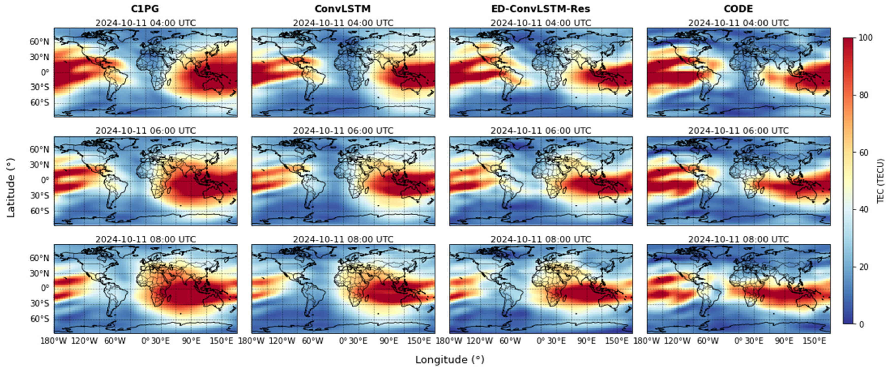 Figure 4. Predicted global TEC maps at 2 h intervals during a geomagnetic storm from UT 04:00 to 08:00 on 11 October 2024 (Dst = −333 nT). Columns (left to right): CODE 1-day-ahead prediction, ConvLSTM 1-day-ahead prediction, ED-ConvLSTM-Res prediction, and CODE ground truth.