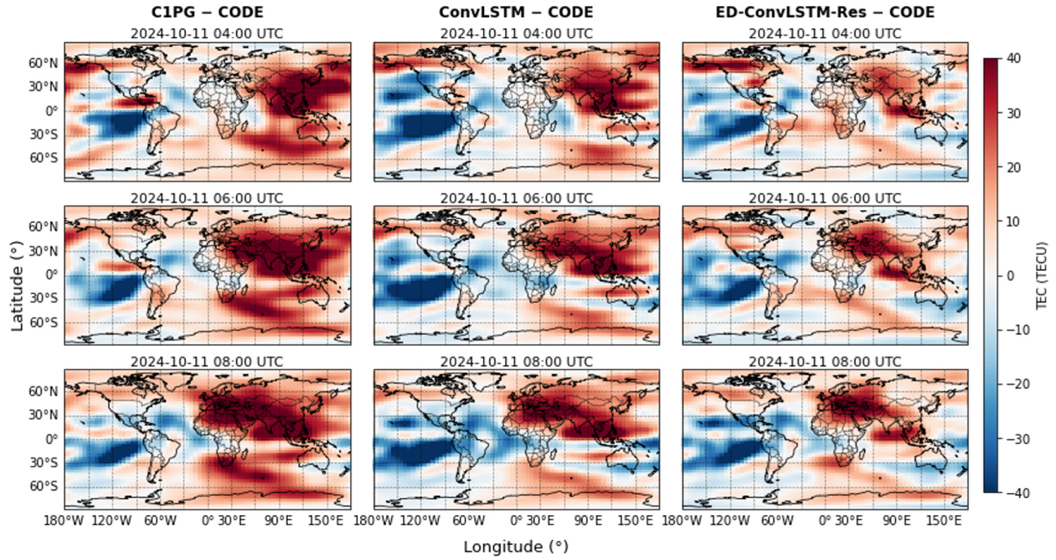 • The ED-ConvLSTM-Res framework, enhanced with solar and geomagnetic indices as auxiliary parameters, provides a reliable and high-precision tool for global ionospheric TEC forecasting, with implications for space weather prediction, satellite-based navigation, and communication systems.
