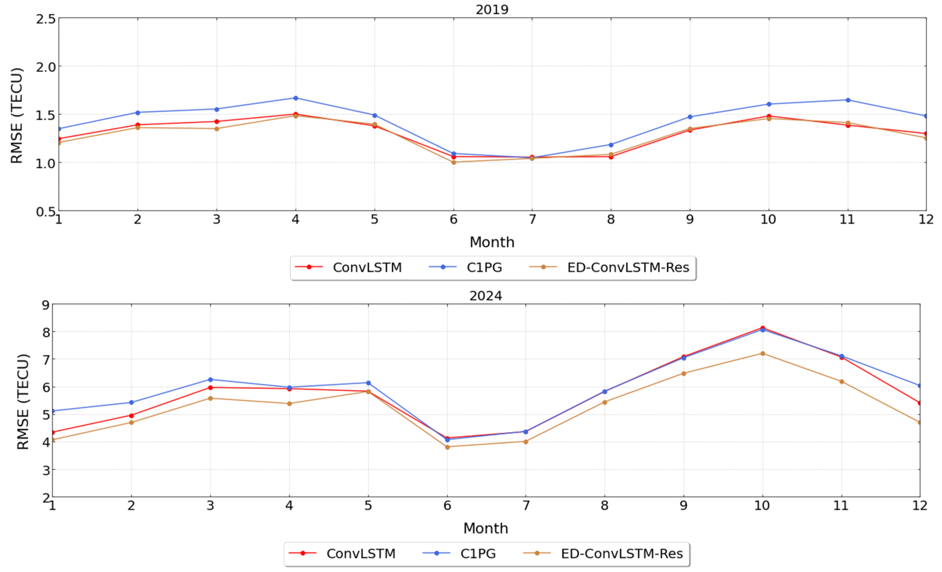 Figure 6. The RMSE values averaged over each month of TEC prediction by ED-ConvLSTM-Res compared with c1pg and ConvLSTM in 2019 (low solar activity year) and 2024 (high solar activity year).