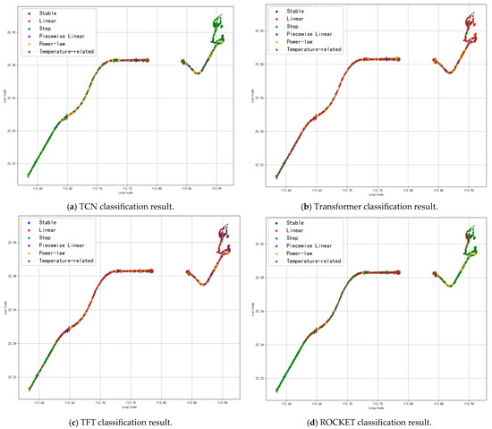 According to Figure 7, the classification results of different models vary significantly in some regions. TCN identifies more of the data from these areas in which slope undergoes sudden changes as step type, while other algorithms identify them as piecewise linear or temperature-related type. The difference between step and piecewise linear is that step type returns to the pre-change trend after the sudden change occurs, while piecewise linear transitions to a different linear trend after the change. In actual InSAR data, these two patterns often have transition zones, and different models have different sensitivities to these transition zones. For practical engineering applications, the focus is often on the location of the mutation points. Therefore, to some extent, this reflects the same trend, namely the time and geographical location where sudden changes may occur.