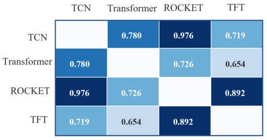 Looking at Figure 7, it is not straightforward to estimate the similarity between the classification results of each model. Since the actual maximum confidence is usually between 50% and 60%, it is easy for each model to produce different results by looking only at the highest confidence type. Therefore, similarity verification of the models’ classification results is carried out, and the results are shown in Figure 8. This indirectly demonstrates the reliability of the classification results, with differences arising from each model’s varying ability to capture different patterns in the data. Therefore, by integrating the feature representations from each model through an adaptive fusion mechanism, the final classification achieves greater reliability and robustness.