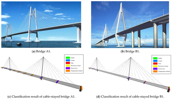 Sometimes, for large sea-crossing bridges, more attention is paid to statically indeterminate structures, which mainly include navigation channel bridges. The classification results of a cable-stayed bridge A1 (one cable-stayed bridge in the study area in Section 3.1) and Bridge B1 (one cable-stayed bridge, i.e., Bridge B in Section 4.2) are shown as Figure 11, where the mid-span is the mainly temperature-related type, while the areas near the bridge towers are predominantly the power law type. Bridge B1 has fewer permanent scatterers. It can also be proven that the number of permanent monitoring scatterers is unstable.