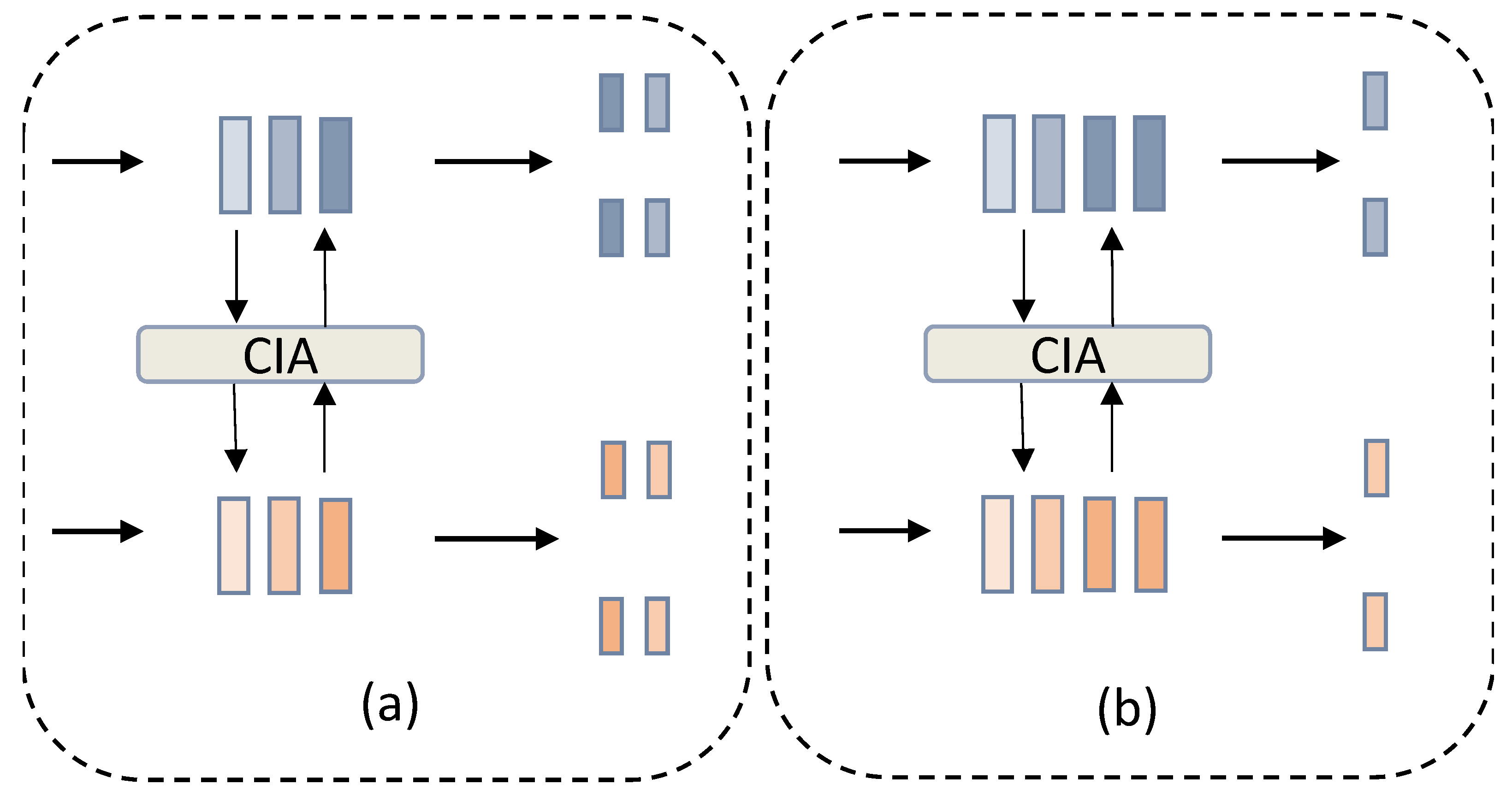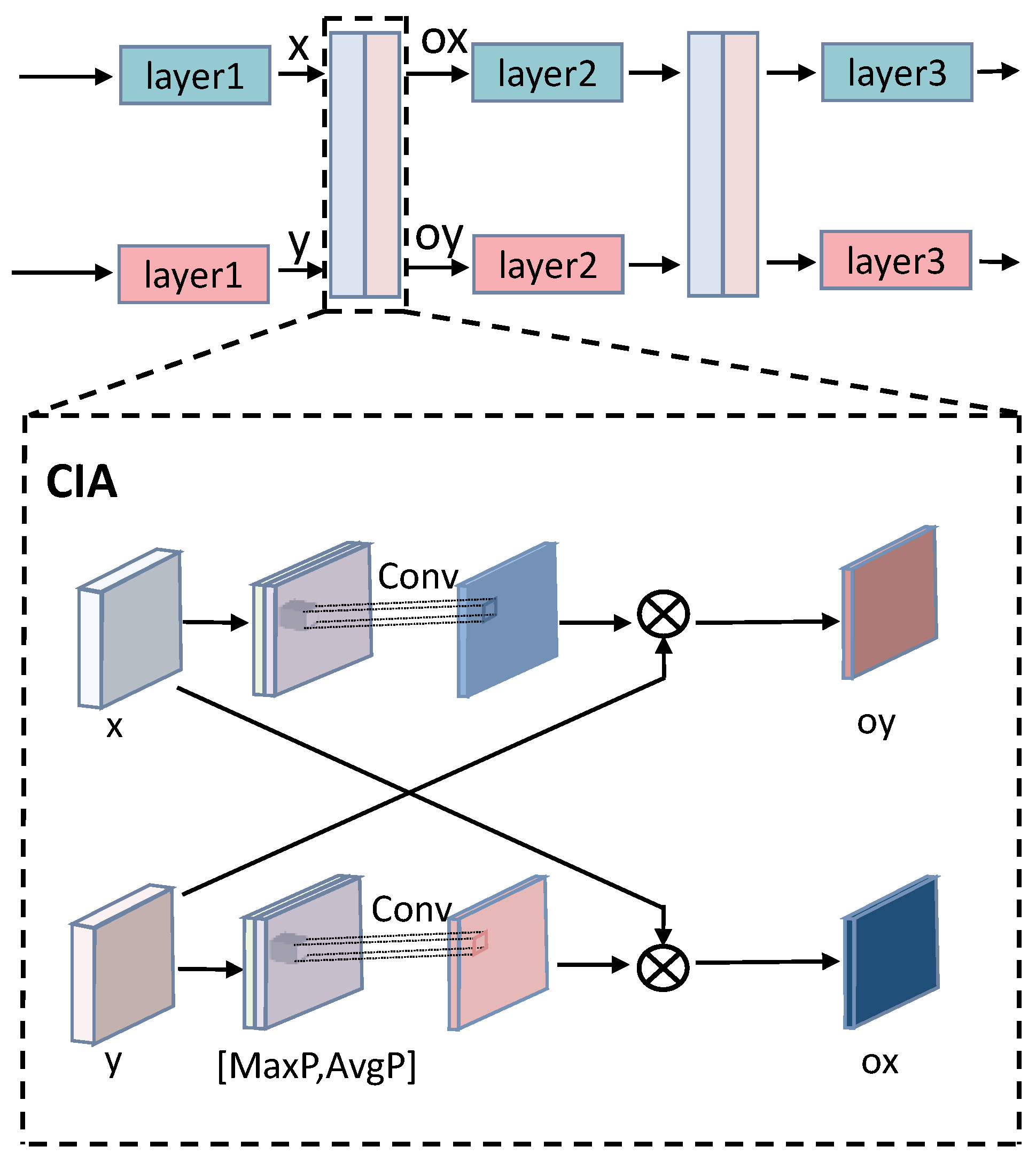 In the encoder section, the network utilizes a VGG-like backbone, which is configured with six 3 × 3 convolutional layers. After every two convolutional layers, a 2 × 2 max pooling layer is applied for spatial downsampling. Notably, between the first four convolutional layers—specifically after every two convolution operations—a CIA module is introduced between two distinct branches.