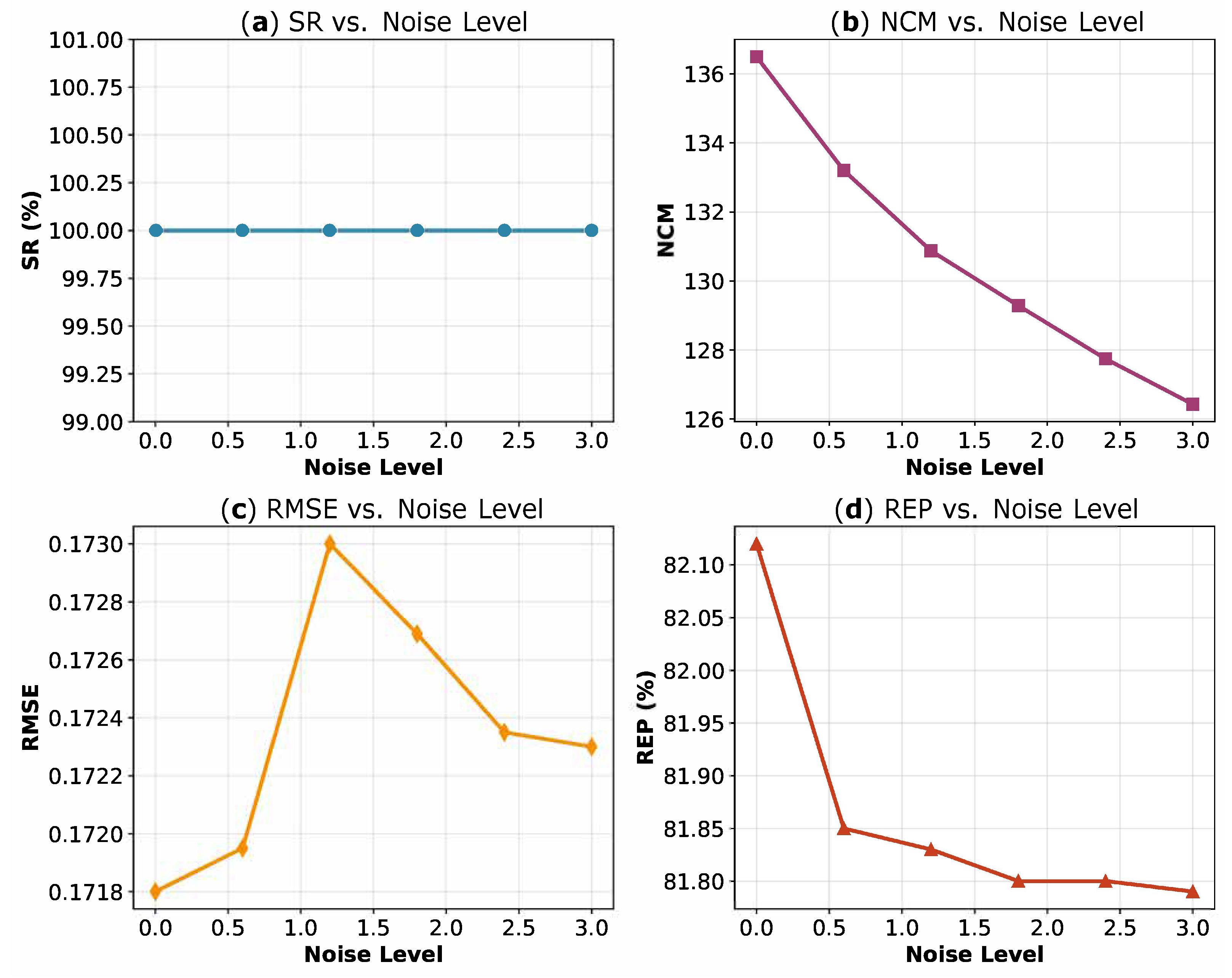 Table 9 for the second type, all metrics exhibit consistent trends with increasing noise: the SR and NCM show a steady decline, while the RMSE rises slightly and the repeatability decreases modestly. Despite these variations, PLISA maintains robust performance across all noise levels, demonstrating its practical utility in real-world scenarios, where the image quality is often compromised.