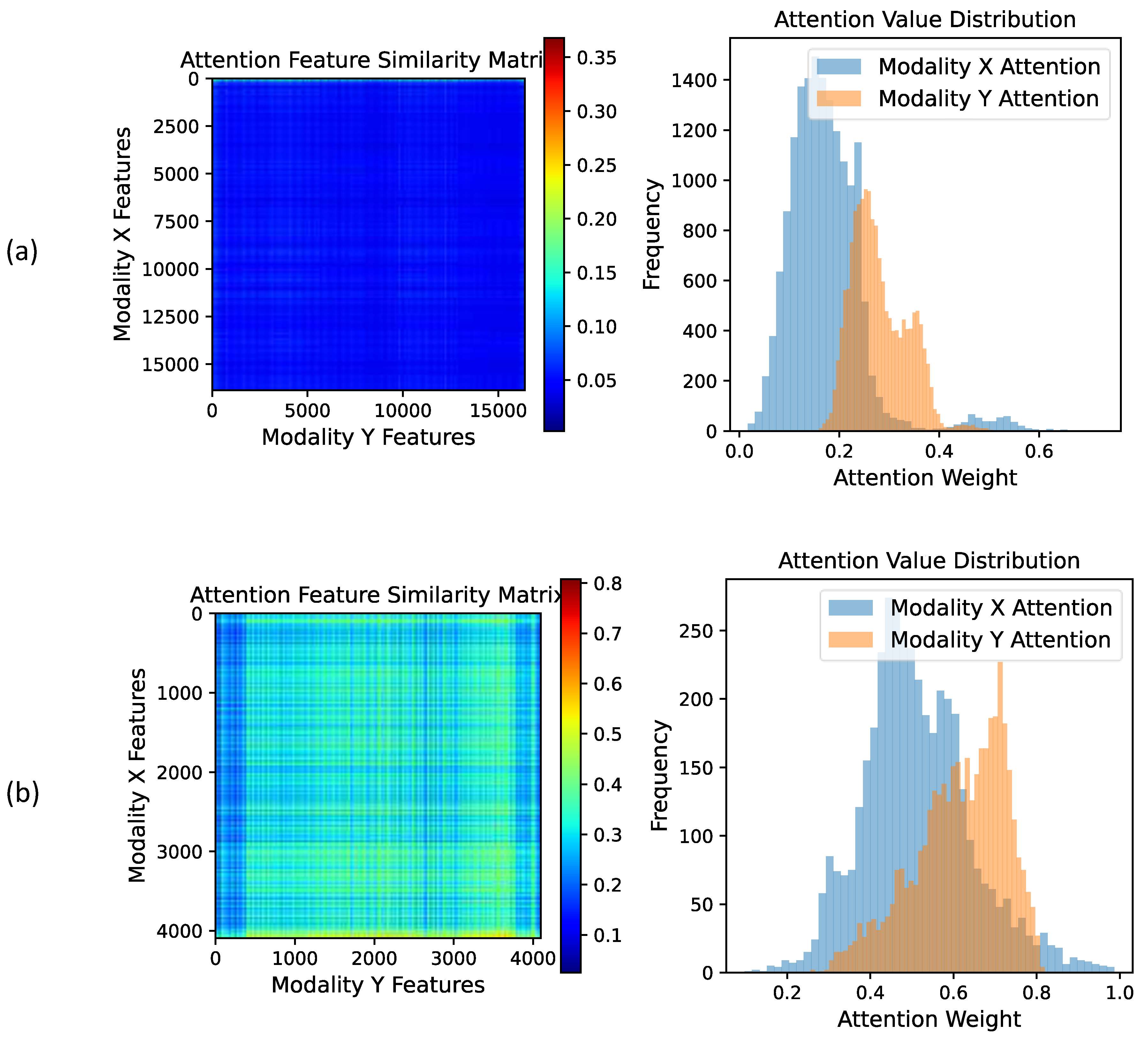 Figure 16 presents the post-CIA attention value distribution and feature similarity matrix. The distribution of the attention weights reveals that, following the application of the CIA module, the alignment between modalities is significantly enhanced, as the distribution of the attention weights across different modalities becomes increasingly similar. By directing each modality to focus on the same salient regions as the other modality, the CIA module facilitates the extraction of more repeatable feature points and the generation of more similar feature vectors for the same point, which is crucial for multimodal image registration. The similarity matrix indicates a significant increase in cross-modal feature similarity after CIA processing, thereby demonstrating the module’s ability to extract more consistent features and, consequently, improving the accuracy of multimodal image registration.