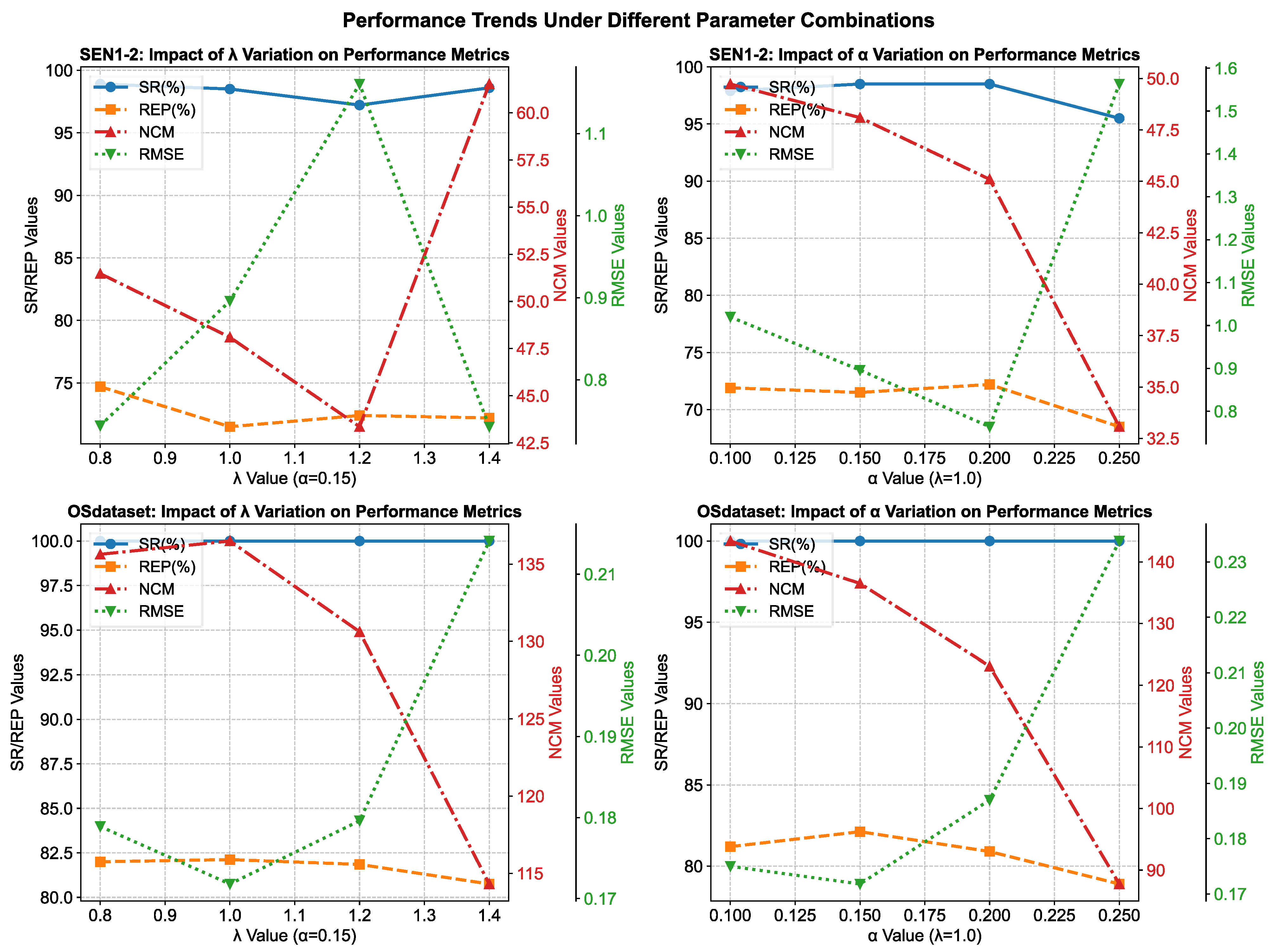 Notably, on OSdataset—used exclusively to test generalization—the model maintained excellent performance across all parameter configurations. While the lowest RMSE was observed at , the highest NCM occurred at , indicating dataset-specific characteristics. However, based on the comprehensive validation on SEN1-2, we fixed the parameters at and for final evaluation. The model achieved remarkably strong performance on OSdataset even with these fixed parameters, demonstrating robust generalization capabilities.